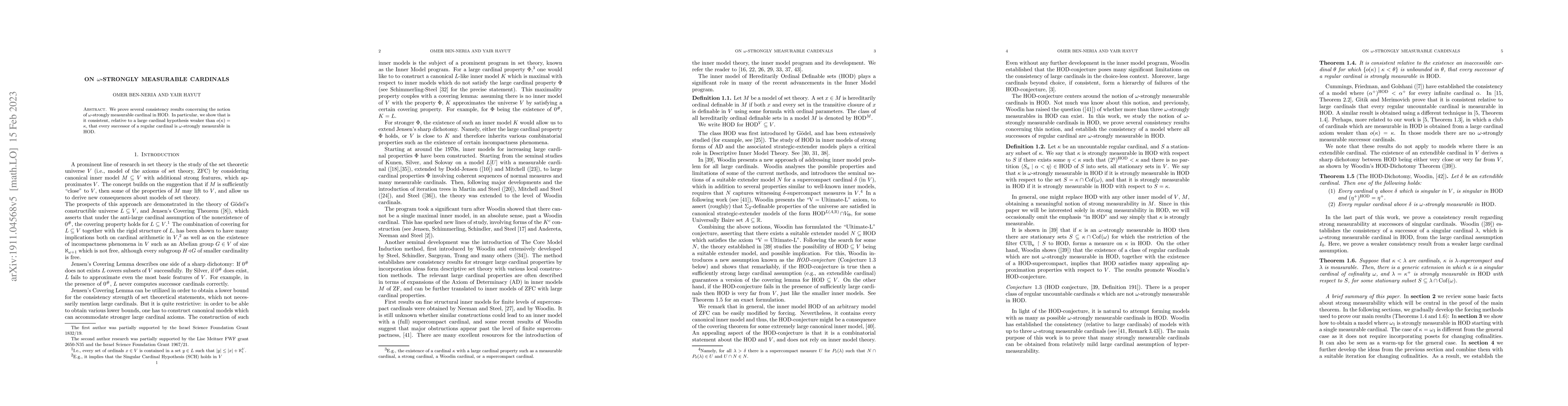 This paper proves consistency results for $\omega$-strongly measurable cardinals within HOD, demonstrating that it is consistent for every successor of a regular cardinal to be $\omega$-strongly measurable, under a large cardinal hypothesis weaker than $o(\kappa) = \kappa$.