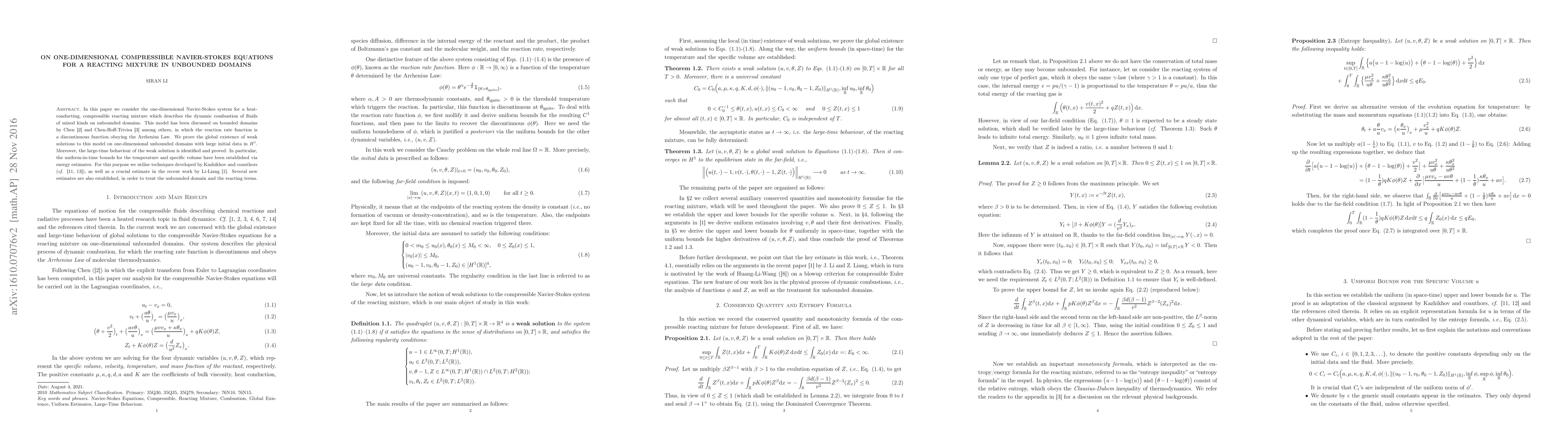 This paper proves the global existence of weak solutions for the one-dimensional Navier-Stokes equations governing a heat-conducting, compressible reacting mixture on unbounded domains, with large initial data in $H^1$. It also establishes uniform-in-time bounds for temperature and specific volume, utilizing techniques from Kazhikhov and recent estimates by Li-Liang.