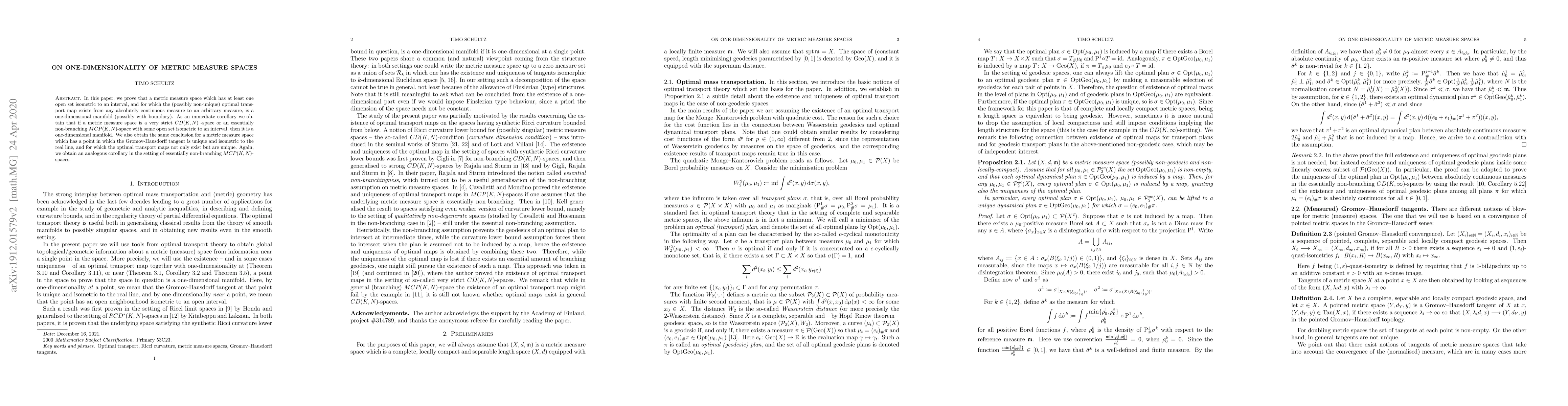 In this paper, we prove that a metric measure space which has at least one open set isometric to an interval, and for which the (possibly non-unique) optimal transport map exists from any absolutely continuous measure to an arbitrary measure, is a one-dimensional manifold (possibly with boundary). As an immediate corollary we obtain that if a metric measure space is a very strict $CD(K,N)$ -space or an essentially non-branching $MCP(K,N)$-space with some open set isometric to an interval, then it is a one-dimensional manifold. We also obtain the same conclusion for a metric measure space which has a point in which the Gromov-Hausdorff tangent is unique and isometric to the real line, and for which the optimal transport maps not only exist but are unique. Again, we obtain an analogous corollary in the setting of essentially non-branching $MCP(K,N)$-spaces.