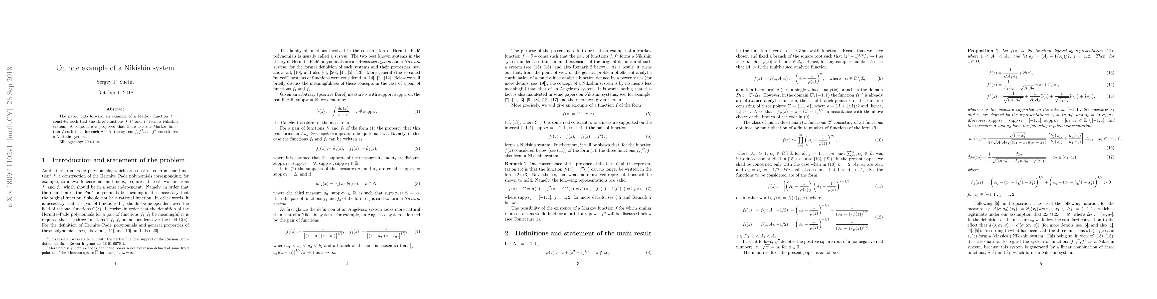 The paper presents a Markov function example where $f$, $f^2$, and $f^3$ form a Nikishin system, and proposes a conjecture about the existence of a Markov function where $f, f^2, \dots, f^n$ form a Nikishin system for all $n$. The study references 20 titles.