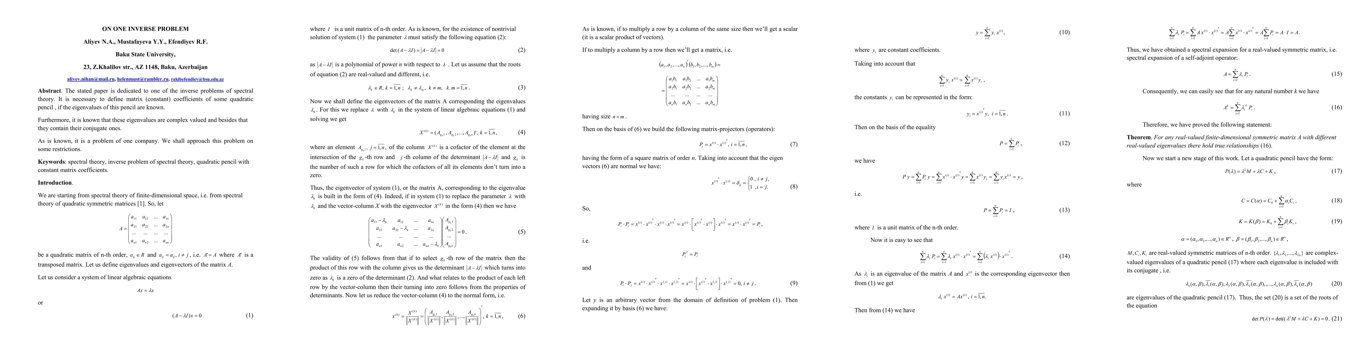 The stated paper is dedicated to one of the inverse problems of spectral theory. It is necessary to define matrix (constant) coefficients of some quadratic pencil, if the eigenvalues of this pencil are known. Furthermore, it is known that these eigenvalues are complex valued and besides that they contain their conjugate ones. As is known, it is a problem of one company. We shall approach this problem on some restrictions.