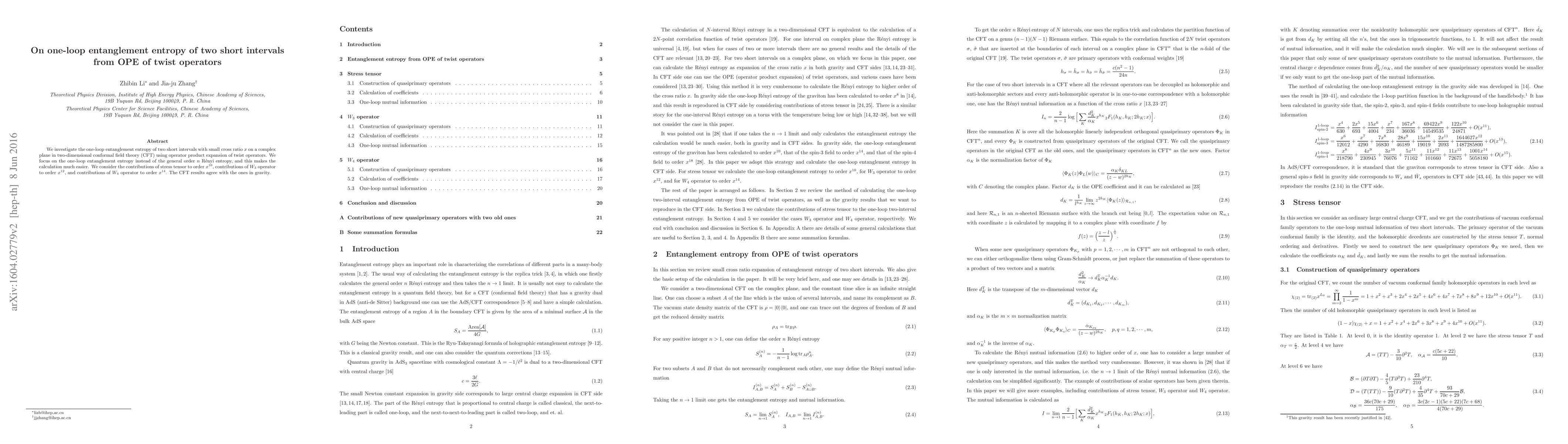 This paper examines the one-loop entanglement entropy of two short intervals in a two-dimensional conformal field theory using the operator product expansion of twist operators. It focuses on contributions from the stress tensor, $W_3$ and $W_4$ operators, and finds agreement between the CFT results and those in gravity.