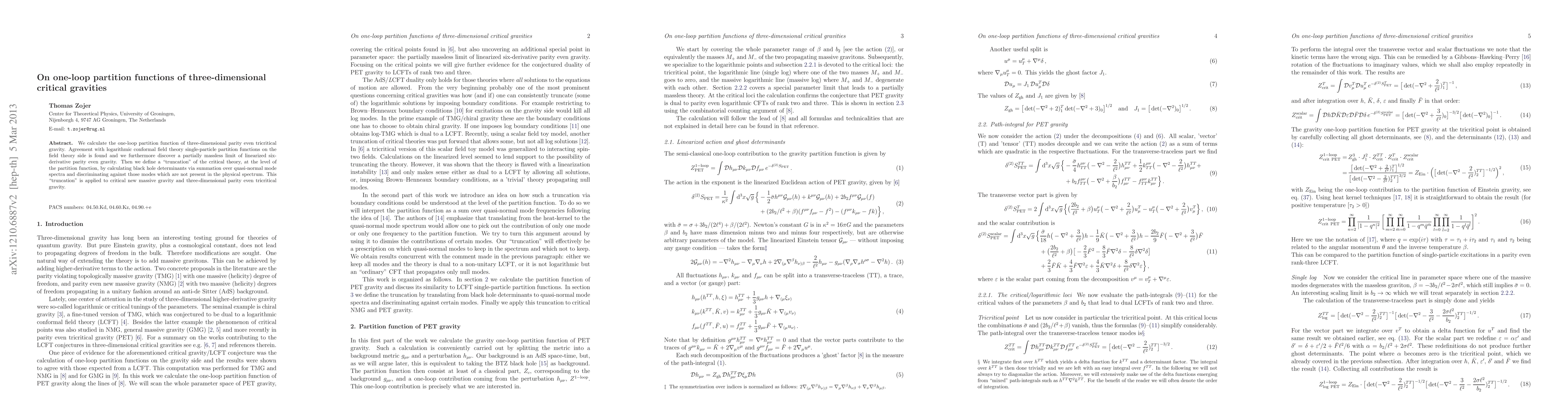 We calculate the gravity one-loop partition function of three-dimensional parity even tricritical gravity. Agreement with logarithmic conformal field theory single-particle partition functions on the field theory side is found and we furthermore discover a partially massless limit of linearized six-derivative parity even gravity. Then we define a "truncation" of the critical theory, at the level of the partition function, by calculating black hole determinants via summation over quasi-normal mode spectra and discriminating against those modes which are not present in the physical spectrum. This "truncation" is applied to critical new massive gravity and three-dimensional parity even tricritical gravity.