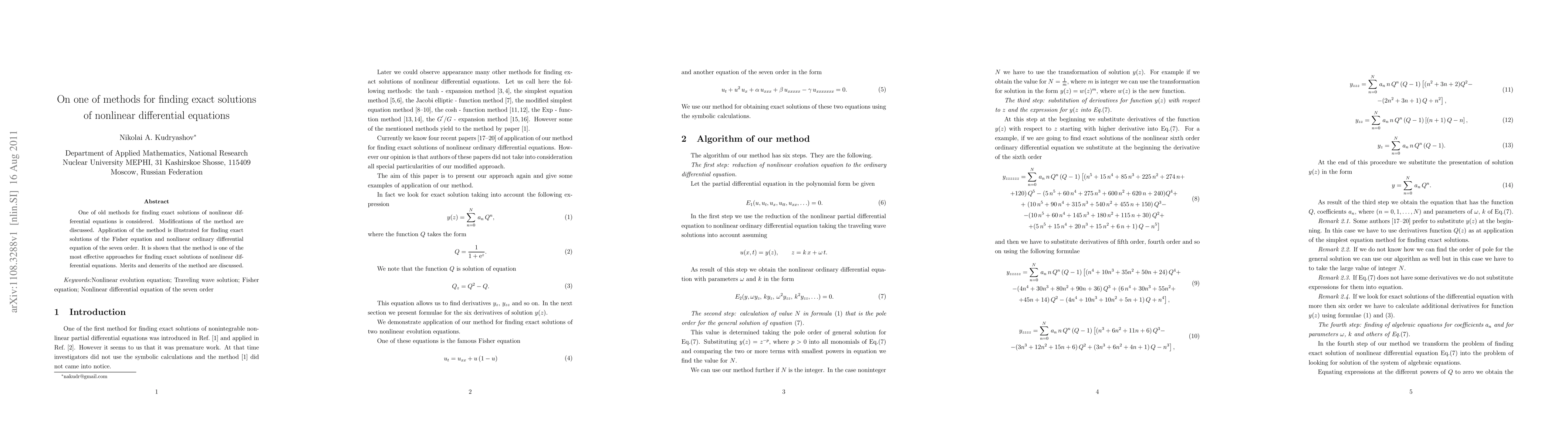 This paper reviews a classical method for obtaining exact solutions of nonlinear differential equations, discusses its modifications, and demonstrates its effectiveness through applications to the Fisher equation and a seventh-order nonlinear ordinary differential equation. The method's advantages and limitations are also evaluated.