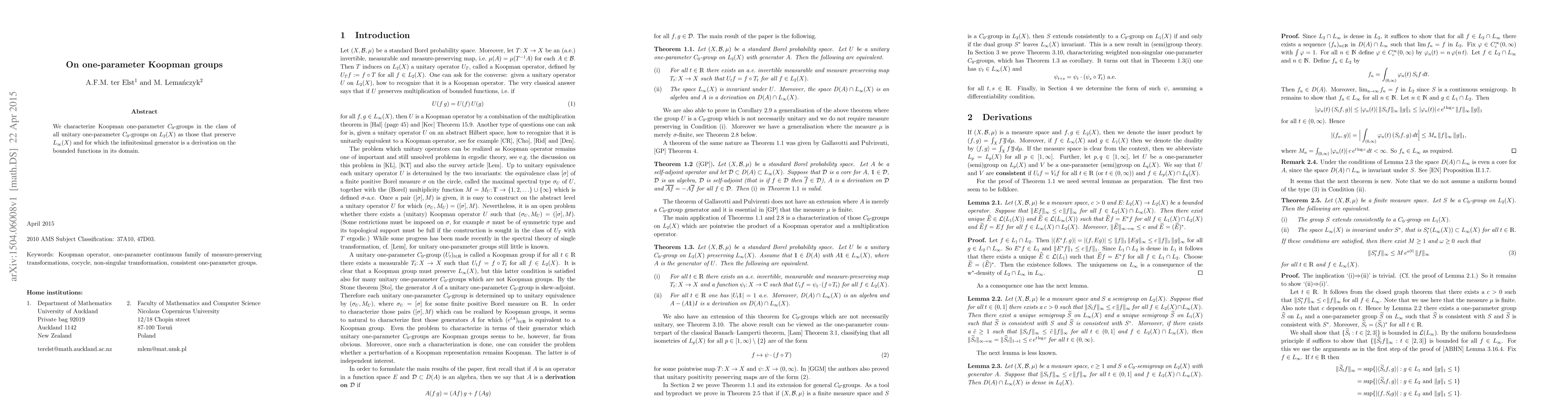 We characterize Koopman one-parameter $C_0$-groups in the class of all unitary one-parameter $C_0$-groups on $L_2(X)$ as those that preserve $L_\infty(X)$ and for which the infinitesimal generator is a derivation on the bounded functions in its domain.