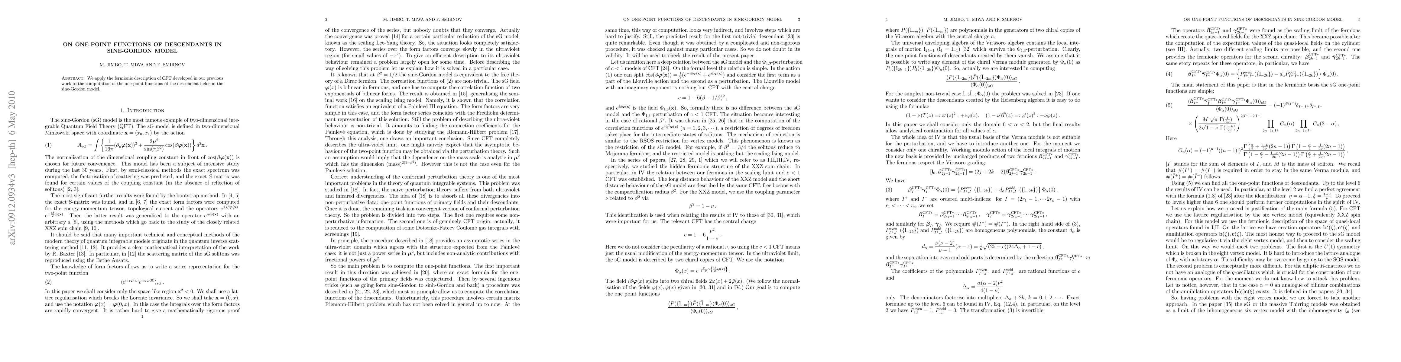 Summary: This paper utilizes the fermionic description of conformal field theory (CFT) from prior research to calculate one-point functions of descendant fields within the sine-Gordon model, providing insights into the model's structure.