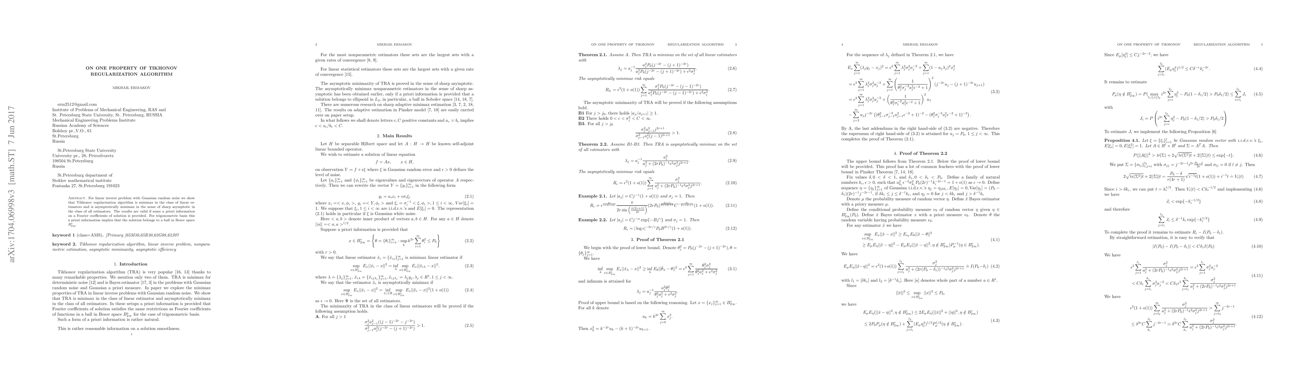 For linear inverse problem with Gaussian random noise we show that Tikhonov regularization algorithm is minimax in the class of linear estimators and is asymptotically minimax in the sense of sharp asymptotic in the class of all estimators. The results are valid if some a priori information on a Fourier coefficients of solution is provided. For trigonometric basis this a priori information implies that the solution belongs to a ball in Besov space $B^r_{2\infty}$.