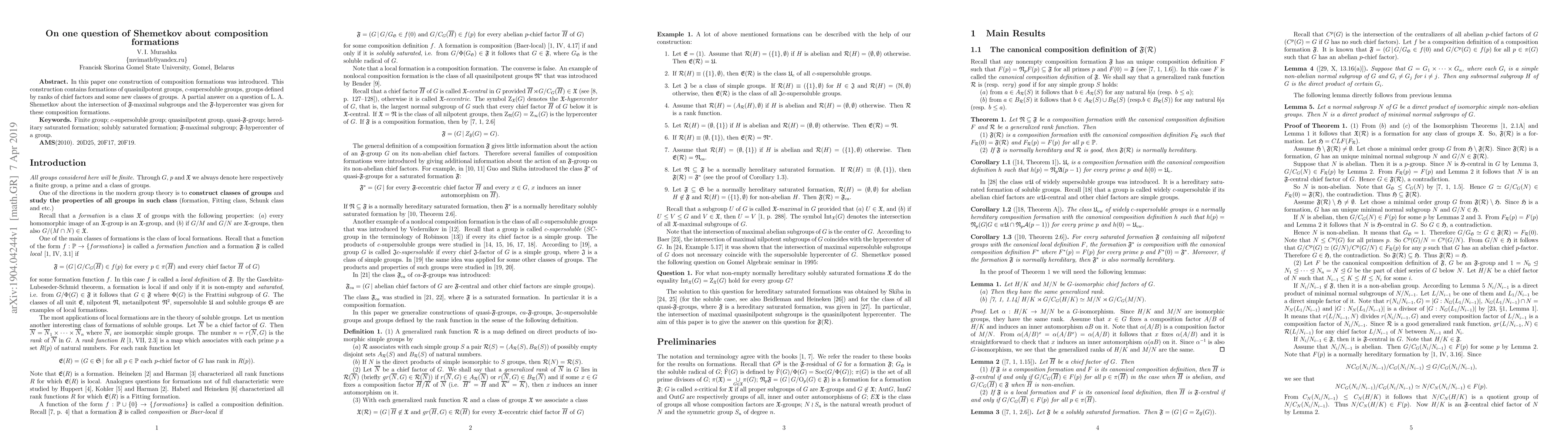 This paper introduces a new construction of composition formations encompassing quasinilpotent and $c$-supersoluble groups, along with some novel classes. It provides a partial resolution to a question by L. A. Shemetkov regarding the intersection of $\mathfrak{F}$-maximal subgroups and the $\mathfrak{F}$-hypercenter within these formations.