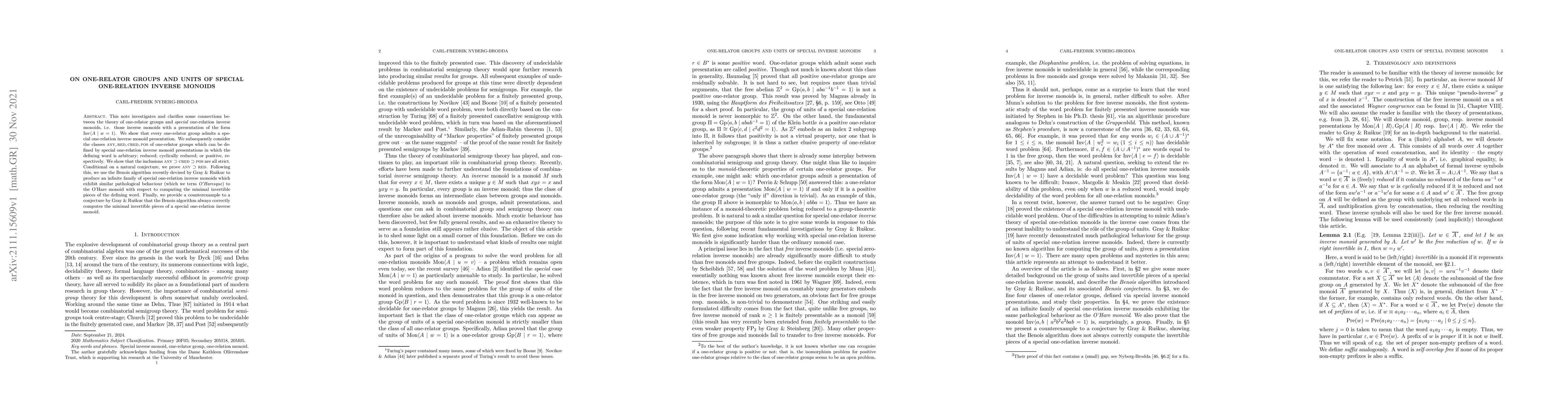 This paper explores the relationship between one-relator groups and special one-relation inverse monoids, demonstrating that every one-relator group can be presented by such monoids. It further classifies these groups based on the nature of their defining words and disproves certain conjectures regarding the Benois algorithm's accuracy.