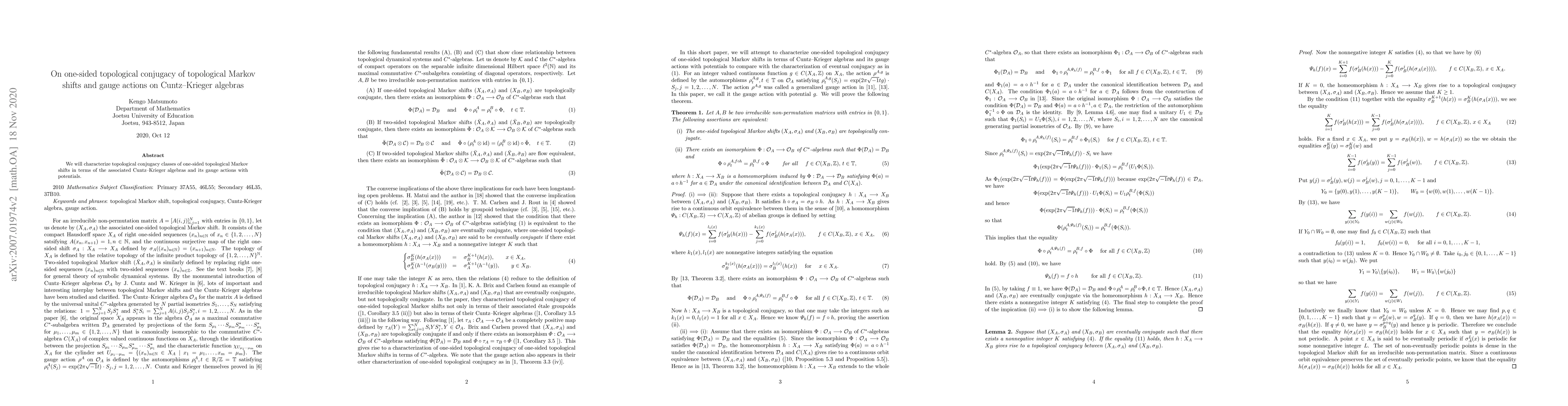 Summary: This paper characterizes the topological conjugacy classes of one-sided topological Markov shifts by linking them to the properties of associated Cuntz-Krieger algebras and their gauge actions with potentials. The study provides a deeper understanding of the structural equivalence between these systems.