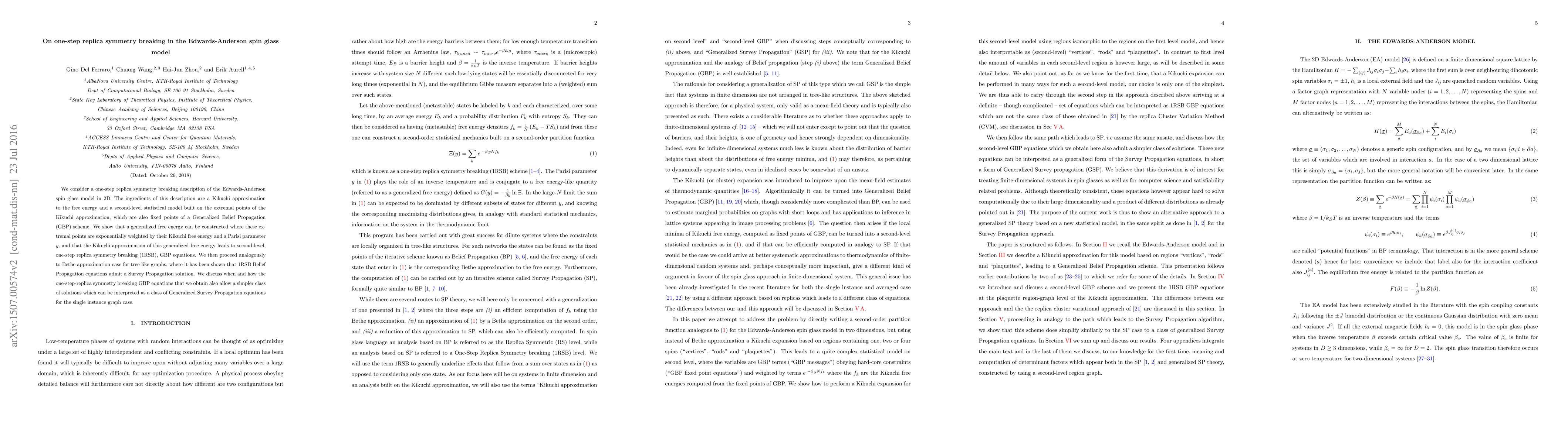 We consider a one-step replica symmetry breaking description of the Edwards-Anderson spin glass model in 2D. The ingredients of this description are a Kikuchi approximation to the free energy and a second-level statistical model built on the extremal points of the Kikuchi approximation, which are also fixed points of a Generalized Belief Propagation (GBP) scheme. We show that a generalized free energy can be constructed where these extremal points are exponentially weighted by their Kikuchi free energy and a Parisi parameter $y$, and that the Kikuchi approximation of this generalized free energy leads to second-level, one-step replica symmetry breaking (1RSB), GBP equations. We then proceed analogously to Bethe approximation case for tree-like graphs, where it has been shown that 1RSB Belief Propagation equations admit a Survey Propagation solution. We discuss when and how the one-step-replica symmetry breaking GBP equations that we obtain also allow a simpler class of solutions which can be interpreted as a class of Generalized Survey Propagation equations for the single instance graph case.