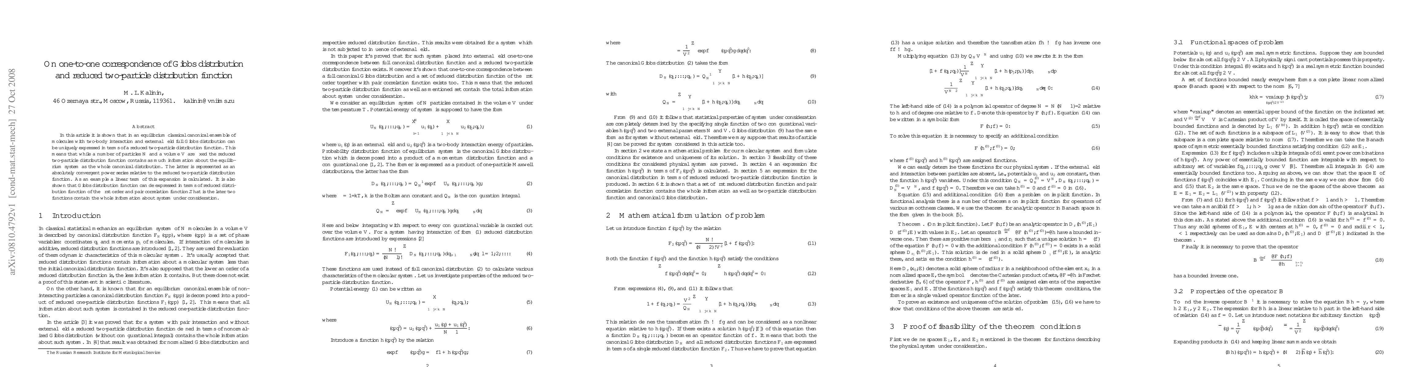 In this article it is shown that in an equilibrium classical canonical ensemble of molecules with two-body interaction and external field full Gibbs distribution can be uniquely expressed in terms of a reduced two-particle distribution function. This means that while a number of particles $N$ and a volume $V$ are fixed the reduced two-particle distribution function contains as much information about the equilibrium system as the whole canonical distribution. The latter is represented as an absolutely convergent power series relative to the reduced two-particle distribution function. As an example a linear term of this expansion is calculated. It is also shown that Gibbs distribution function can de expressed in terms of reduced distribution function of the first order and pair correlation function.That is the later two functions contain the whole information about system under consideration.