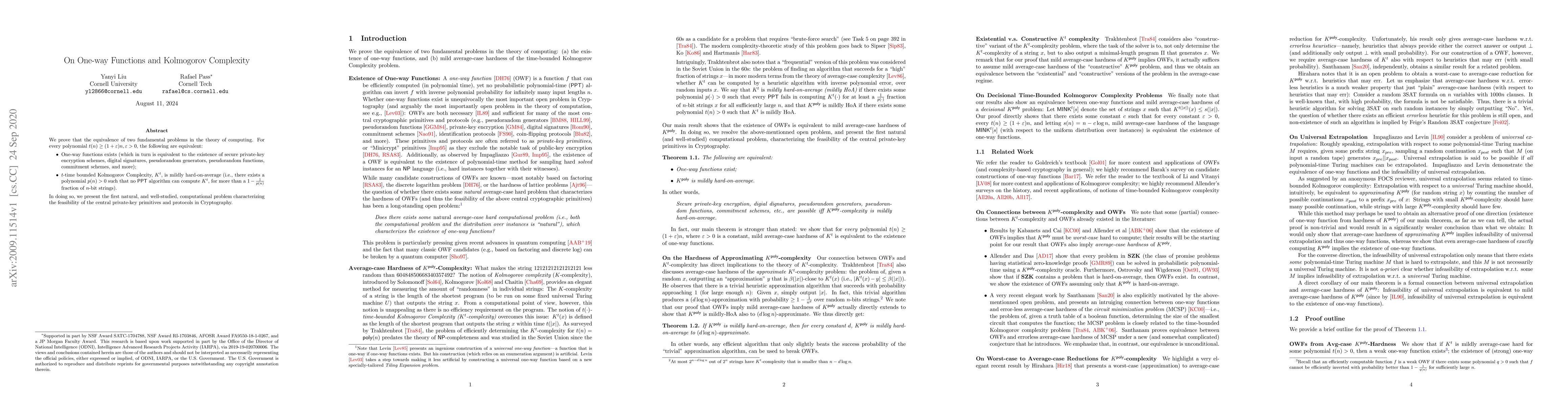 This paper establishes that the existence of one-way functions, crucial for secure cryptographic schemes, is equivalent to the notion that $t$-time bounded Kolmogorov Complexity is mildly hard-on-average for sufficiently large $t$. This provides a natural computational problem characterizing the feasibility of fundamental cryptographic primitives.