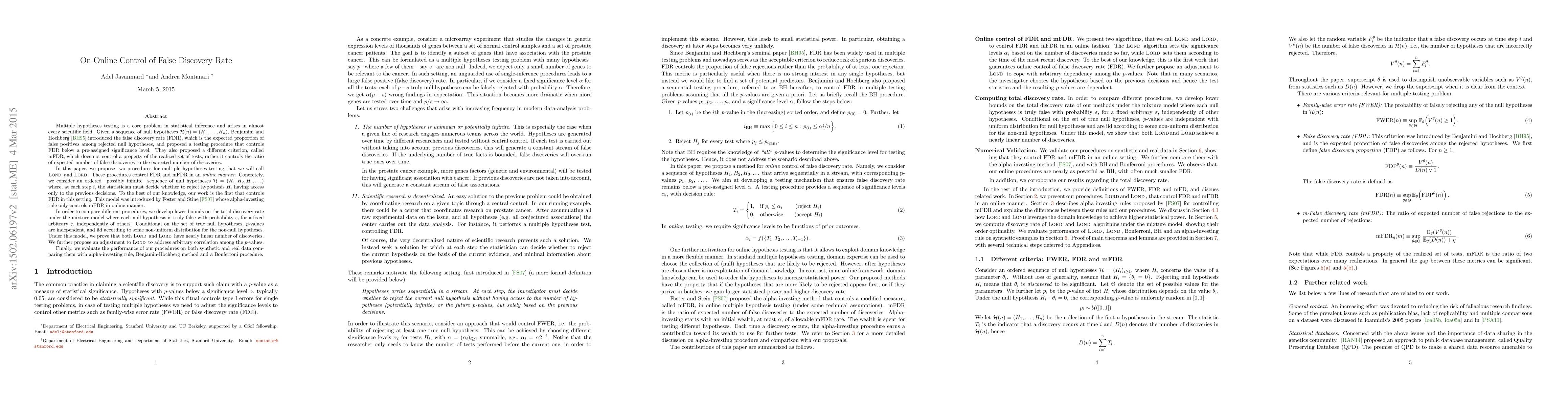 This paper introduces two online procedures, LOND and LORD, for controlling the false discovery rate (FDR) and the modified FDR (mFDR) in a sequential testing framework. It evaluates their performance against existing methods on both synthetic and real data.