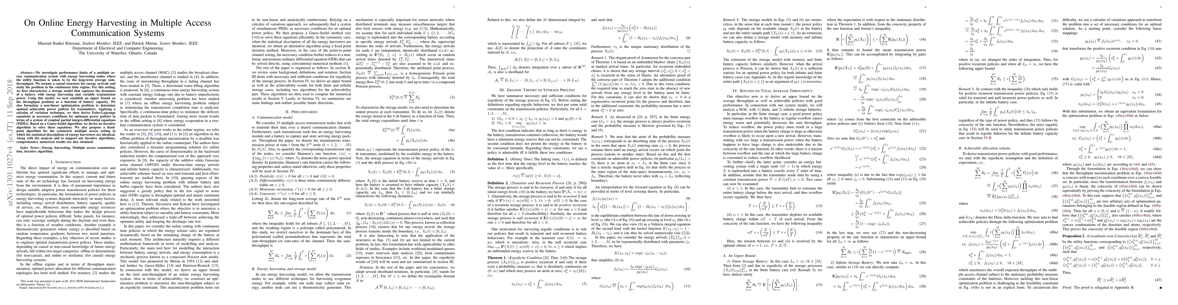 This paper explores the performance limits of multiple access communication systems with energy harvesting nodes, focusing on long-term average sum-throughput. It develops a storage dam model for battery dynamics and derives optimal power policies using calculus of variations and iterative algorithms, supported by numerical results.