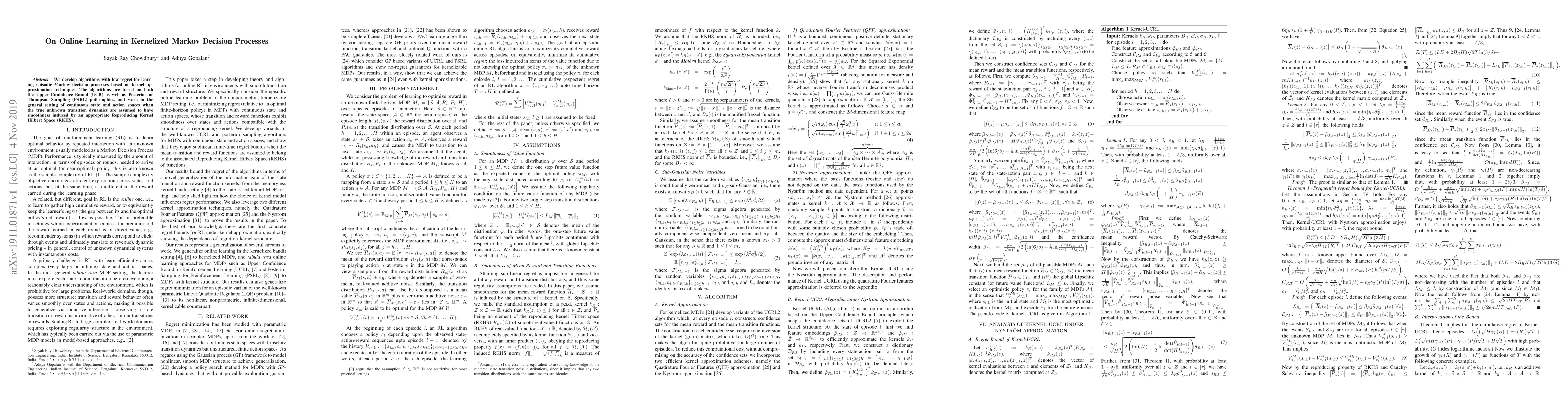 This paper proposes algorithms for online learning in kernelized Markov decision processes, utilizing kernel approximation techniques with low regret. It combines Upper Confidence Bound (UCB) and Posterior Sampling (PSRL) methods for continuous state and action spaces, assuming smoothness via Reproducing Kernel Hilbert Space (RKHS).