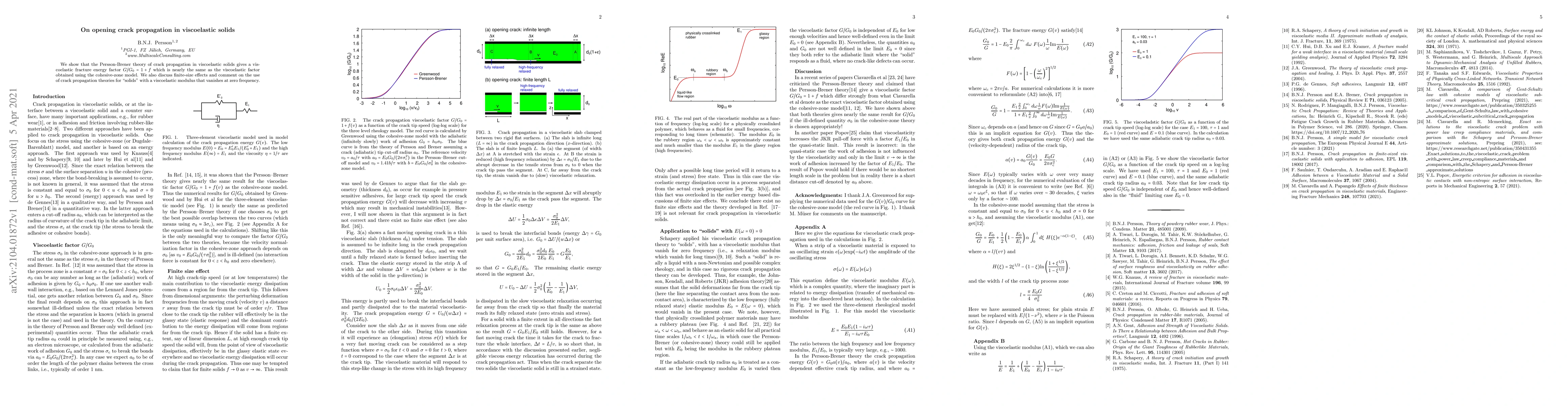 We show that the Persson-Brener theory of crack propagation in viscoelastic solids gives a viscoelastic fracture energy factor $G/G_0 = 1+f$ which is nearly the same as the viscoelastic factor obtained using the cohesive-zone model. We also discuss finite-size effects and comment on the use of crack propagation theories for "solids" with a viscoelastic modulus that vanishes at zero frequency.