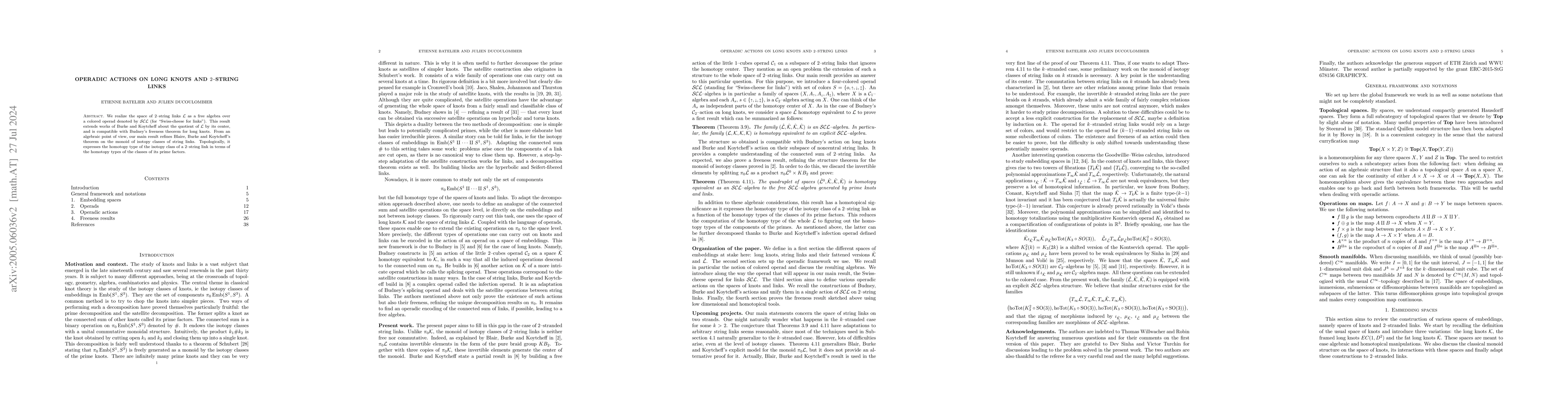 This paper constructs the space of string 2-links as a free algebra over a colored operad, extending previous works and aligning with Budney's freeness theorem for long knots. It topologically relates the homotopy type of a string 2-link to those of its prime factors.