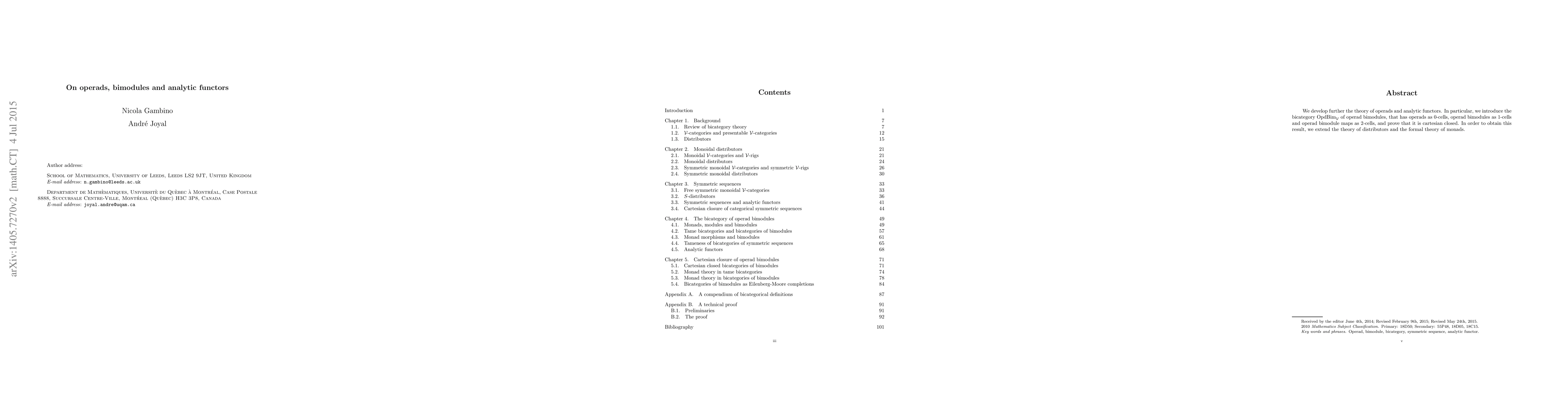 This paper advances the theory of operads and analytic functors by introducing a bicategory with operads, bimodules, and bimodule maps, proving its cartesian closedness. It also extends the theory of distributors and monads to support this development.
