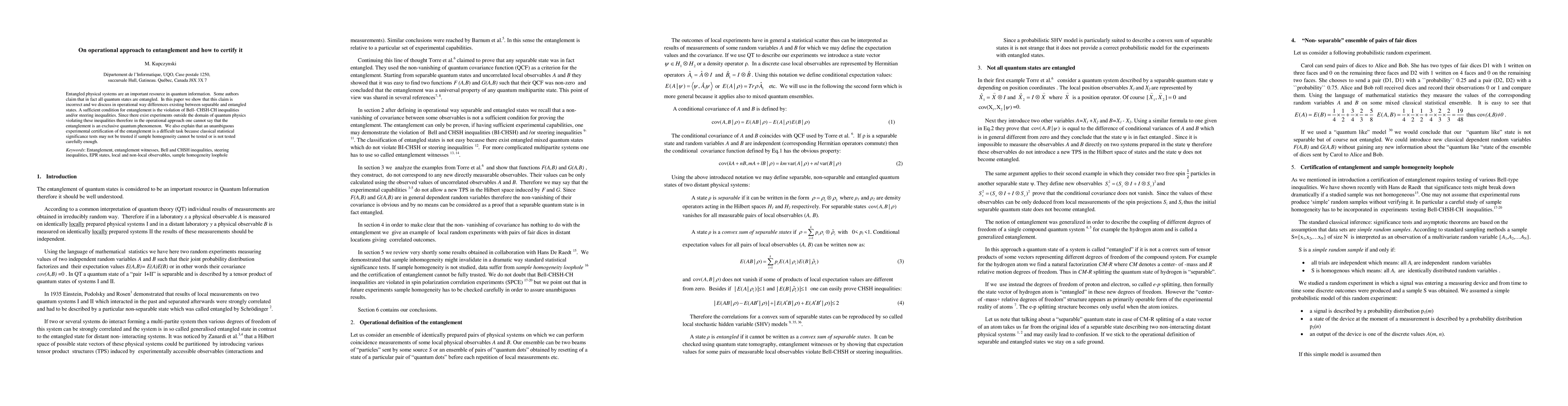 Entangled physical systems are an important resource in quantum information. Some authors claim that in fact all quantum states are entangled. In this paper we show that this claim is incorrect and we discuss in operational way differences existing between separable and entangled states. A sufficient condition for entanglement is the violation of Bell- CHSH-CH inequalities and/or steering inequalities. Since there exist experiments outside the domain of quantum physics violating these inequalities therefore in the operational approach one cannot say that the entanglement is an exclusive quantum phenomenon. We also explain that an unambiguous experimental certification of the entanglement is a difficult task because classical statistical significance tests may not be trusted if sample homogeneity cannot be tested or is not tested carefully enough.