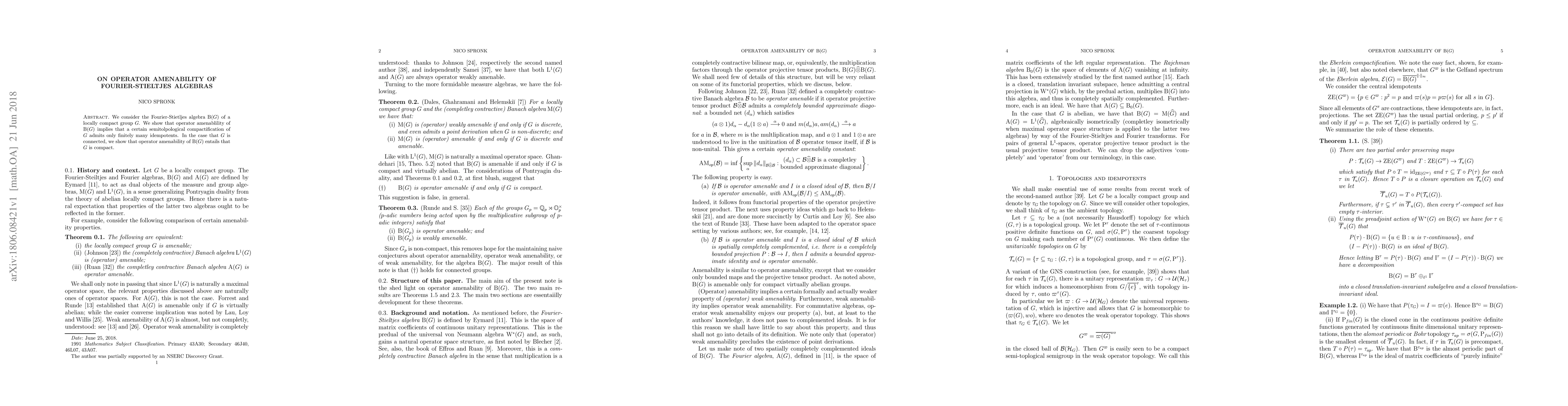 We consider the Fourier-Stietljes algebra B(G) of a locally compact group G. We show that operator amenablility of B(G) implies that a certain semitolpological compactification of G admits only finitely many idempotents. In the case that G is connected, we show that operator amenability of B(G) entails that $G$ is compact.