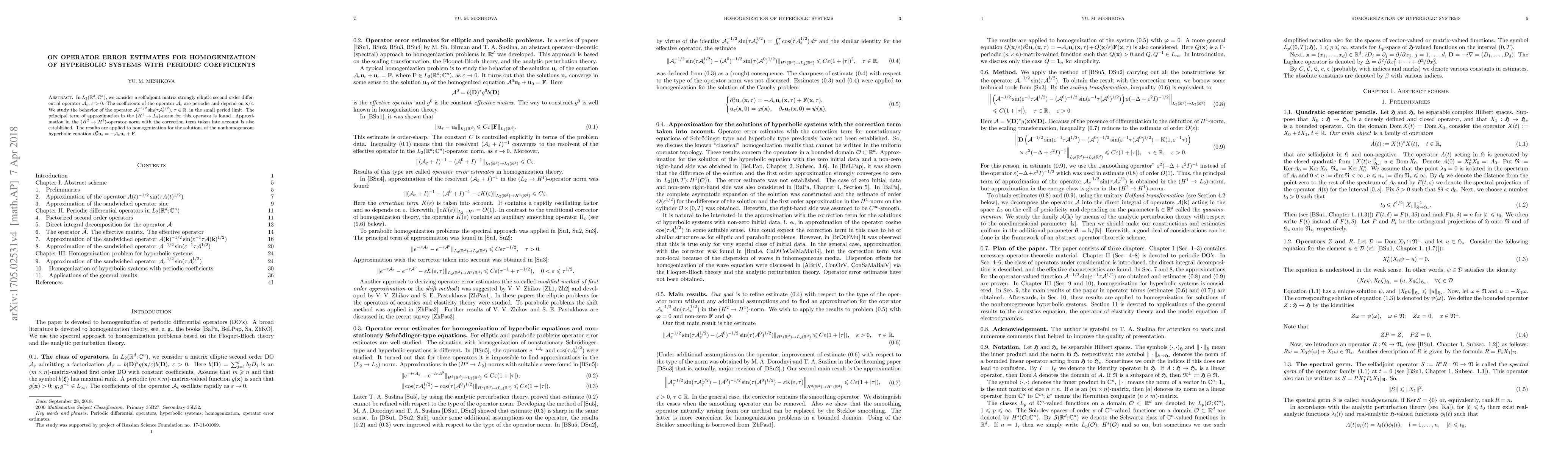 This paper investigates operator error estimates for homogenization of hyperbolic systems with periodic coefficients, focusing on the behavior of $\mathcal{A}_\varepsilon^{-1/2}\sin (\tau \mathcal{A}_\varepsilon^{1/2})$ in the small period limit. It provides an approximation for the operator in $(H^1\rightarrow L_2)$-norm and establishes an improved $(H^2\rightarrow H^1)$-norm approximation with correction terms, applying the results to homogenized solutions of a nonhomogeneous hyperbolic equation.
