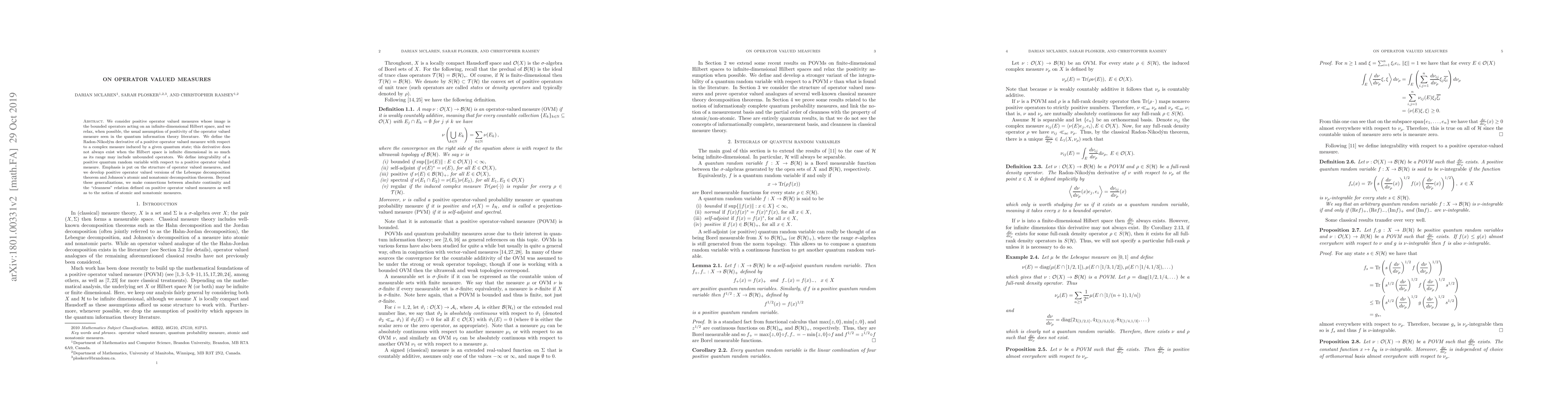 This paper explores positive operator valued measures on infinite-dimensional Hilbert spaces, relaxing typical positivity assumptions. It introduces the Radon-Nikodym derivative for such measures and discusses their integrability, developing operator-valued versions of the Lebesgue and Johnson decomposition theorems, and linking these to notions of absolute continuity and "cleanness."