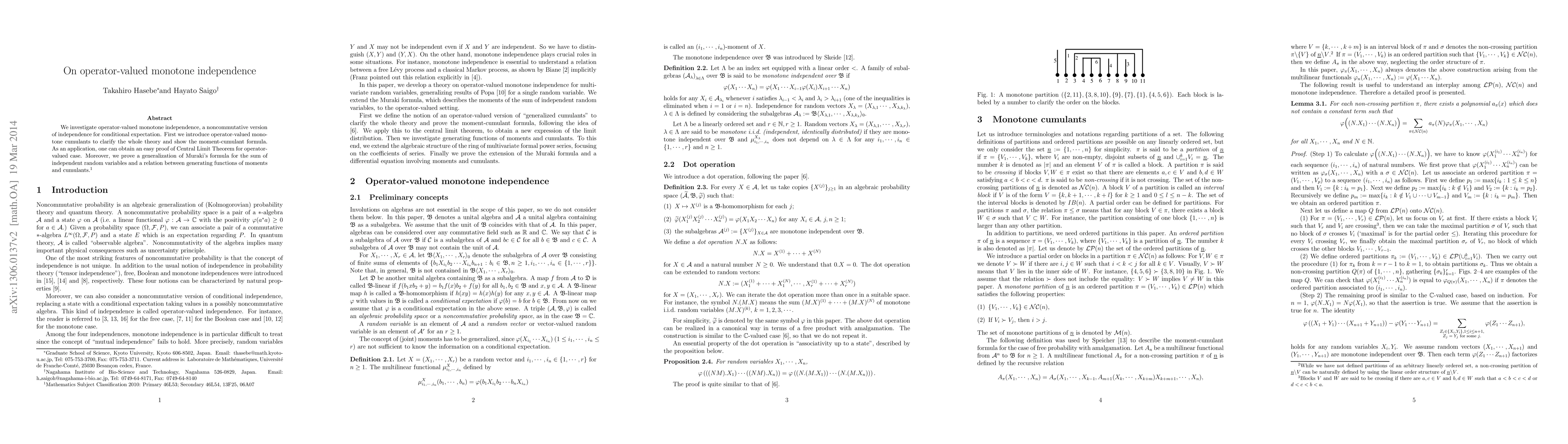 This paper explores operator-valued monotone independence, introducing operator-valued monotone cumulants and proving a moment-cumulant formula. It provides an easy proof of the Central Limit Theorem for the operator-valued case and generalizes Muraki's formula for independent random variables.