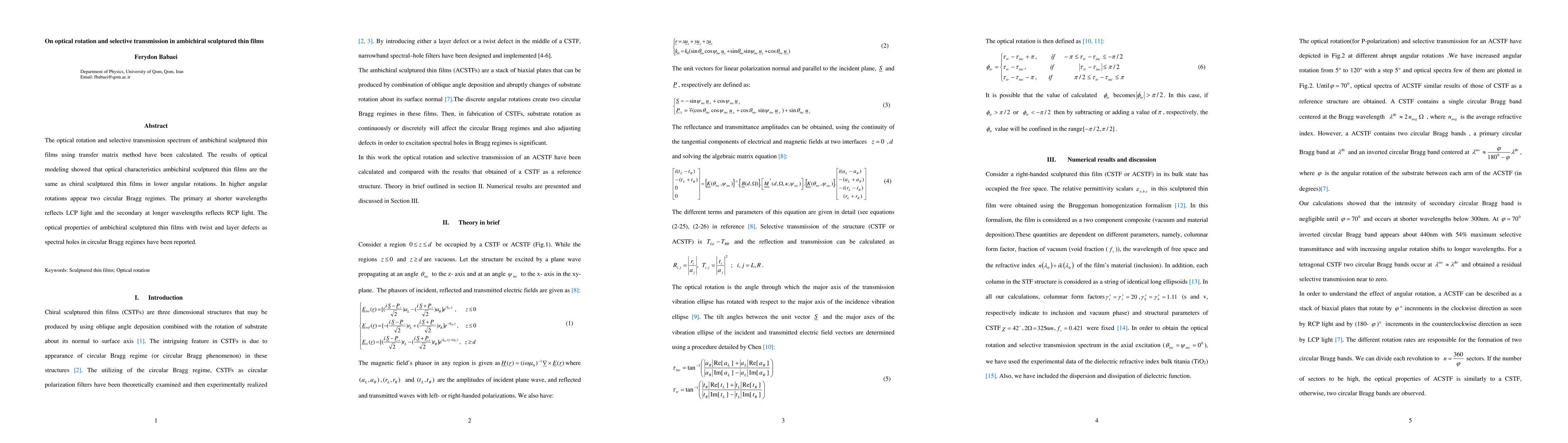 This study calculates optical rotation and selective transmission in ambichiral sculptured thin films using the transfer matrix method, finding similar optical characteristics to chiral films at lower angles but revealing two distinct circular Bragg regimes at higher angles, with spectral holes due to twist and layer defects.