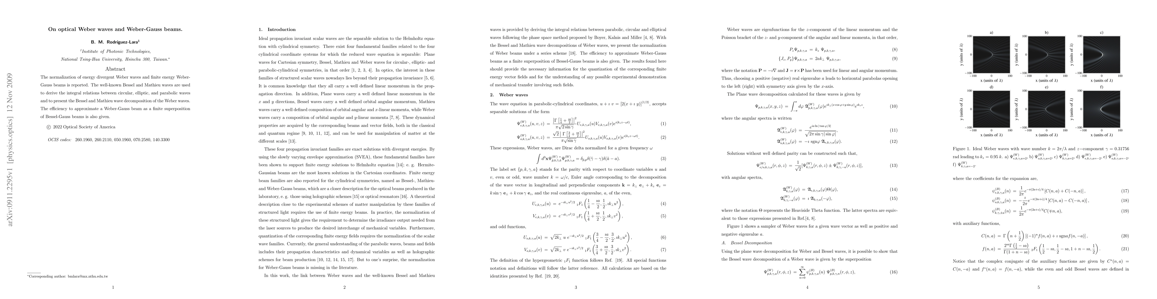 The normalization of energy divergent Weber waves and finite energy Weber-Gauss beams is reported. The well-known Bessel and Mathieu waves are used to derive the integral relations between circular, elliptic, and parabolic waves and to present the Bessel and Mathieu wave decomposition of the Weber waves. The efficiency to approximate a Weber-Gauss beam as a finite superposition of Bessel-Gauss beams is also given.