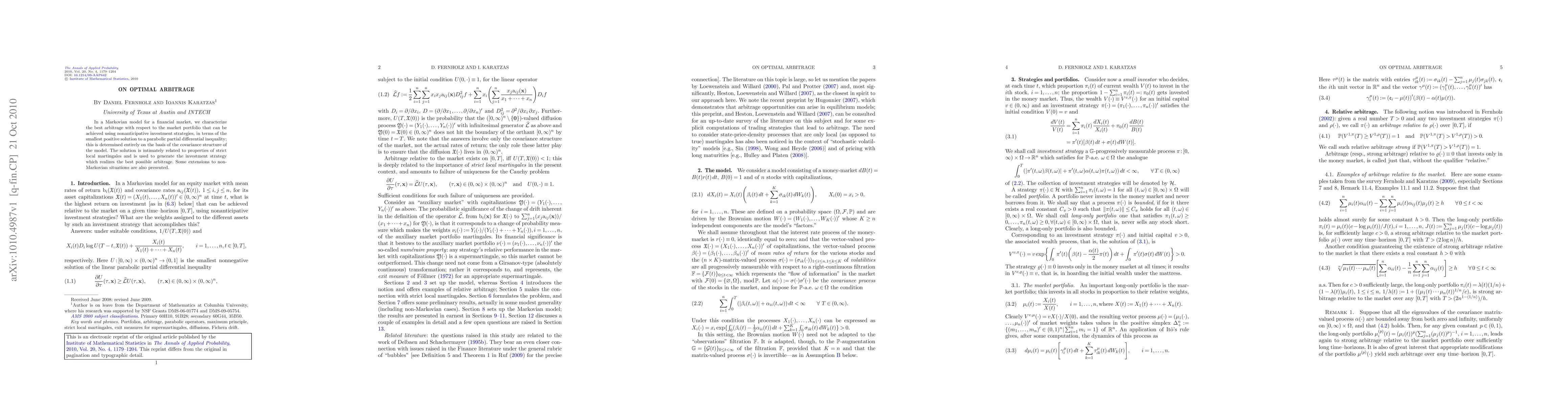 In a Markovian model for a financial market, we characterize the best arbitrage with respect to the market portfolio that can be achieved using nonanticipative investment strategies, in terms of the smallest positive solution to a parabolic partial differential inequality; this is determined entirely on the basis of the covariance structure of the model. The solution is intimately related to properties of strict local martingales and is used to generate the investment strategy which realizes the best possible arbitrage. Some extensions to non-Markovian situations are also presented.