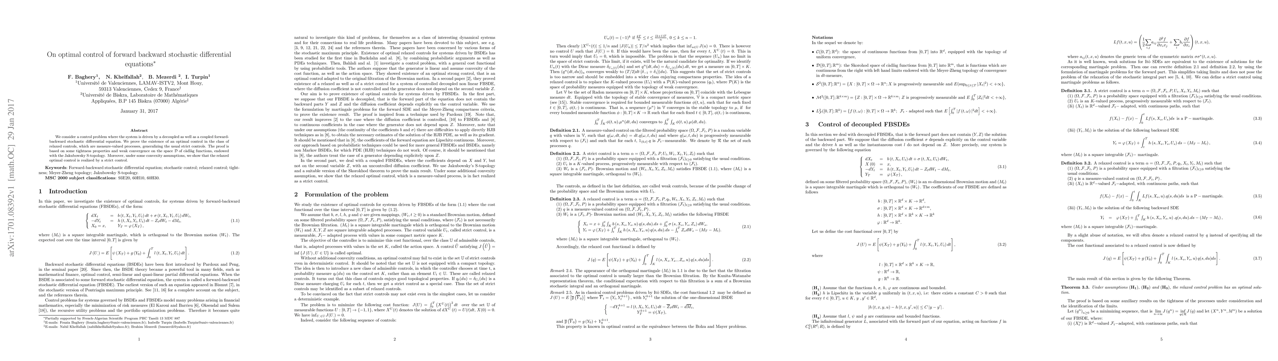 We consider a control problem where the system is driven by a decoupled as well as a coupled forward-backward stochastic differential equation. We prove the existence of an optimal control in the class of relaxed controls, which are measure-valued processes, generalizing the usual strict controls. The proof is based on some tightness properties and weak convergence on the space D of c\`adl\`ag functions, endowed with the Jakubowsky S-topology. Moreover, under some convexity assumptions, we show that the relaxed optimal control is realized by a strict control.
