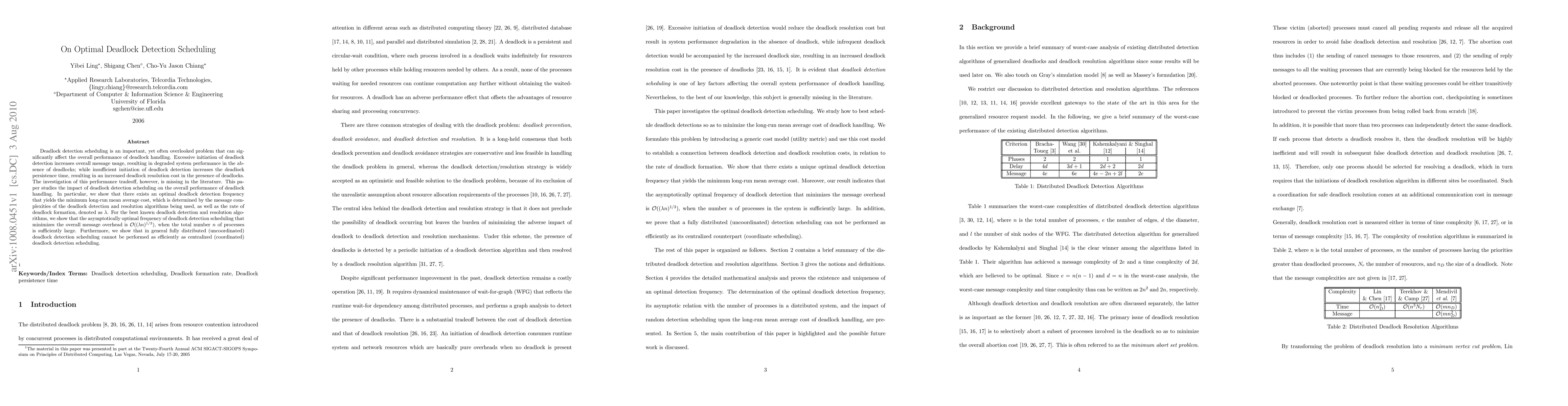 Deadlock detection scheduling is an important, yet often overlooked problem that can significantly affect the overall performance of deadlock handling. Excessive initiation of deadlock detection increases overall message usage, resulting in degraded system performance in the absence of deadlocks; while insufficient initiation of deadlock detection increases the deadlock persistence time, resulting in an increased deadlock resolution cost in the presence of deadlocks. The investigation of this performance tradeoff, however, is missing in the literature. This paper studies the impact of deadlock detection scheduling on the overall performance of deadlock handling. In particular, we show that there exists an optimal deadlock detection frequency that yields the minimum long-run mean average cost, which is determined by the message complexities of the deadlock detection and resolution algorithms being used, as well as the rate of deadlock formation, denoted as $\lambda$. For the best known deadlock detection and resolution algorithms, we show that the asymptotically optimal frequency of deadlock detection scheduling that minimizes the overall message overhead is ${\cal O}((\lambda n)^{1/3})$, when the total number $n$ of processes is sufficiently large. Furthermore, we show that in general fully distributed (uncoordinated) deadlock detection scheduling cannot be performed as efficiently as centralized (coordinated) deadlock detection scheduling.