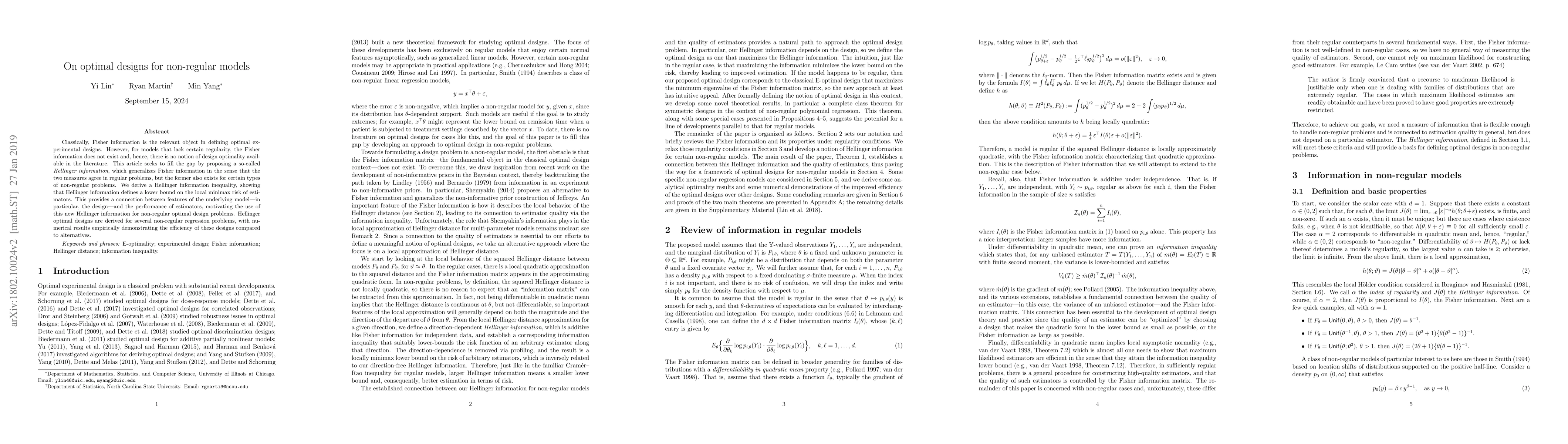Classically, Fisher information is the relevant object in defining optimal experimental designs. However, for models that lack certain regularity, the Fisher information does not exist and, hence, there is no notion of design optimality available in the literature. This article seeks to fill the gap by proposing a so-called Hellinger information, which generalizes Fisher information in the sense that the two measures agree in regular problems, but the former also exists for certain types of non-regular problems. We derive a Hellinger information inequality, showing that Hellinger information defines a lower bound on the local minimax risk of estimators. This provides a connection between features of the underlying model---in particular, the design---and the performance of estimators, motivating the use of this new Hellinger information for non-regular optimal design problems. Hellinger optimal designs are derived for several non-regular regression problems, with numerical results empirically demonstrating the efficiency of these designs compared to alternatives.