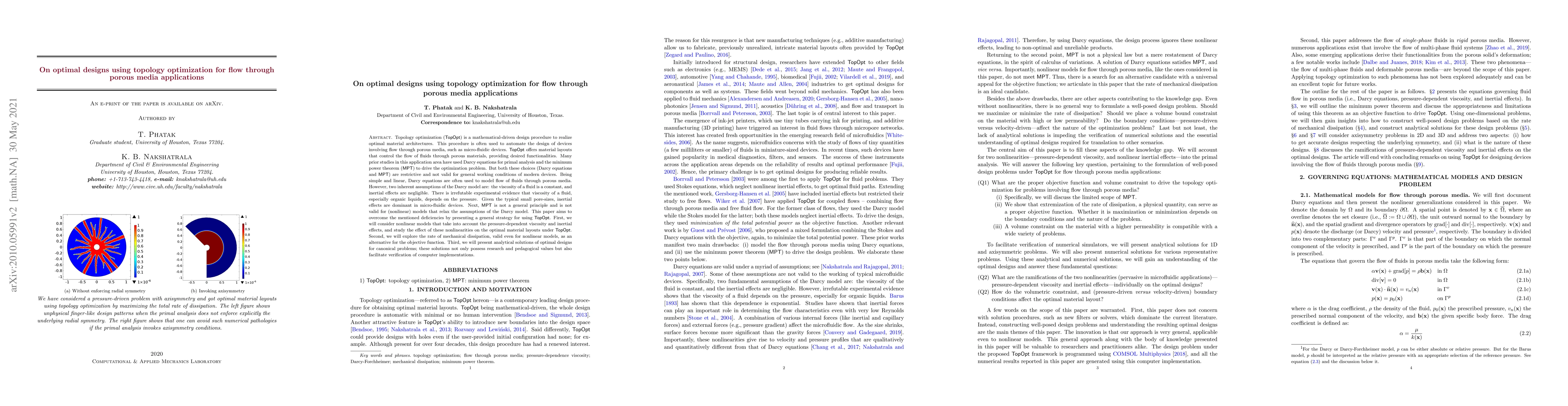 Topology optimization (TopOpt) is a mathematical-driven design procedure to realize optimal material architectures. This procedure is often used to automate the design of devices involving flow through porous media, such as micro-fluidic devices. TopOpt offers material layouts that control the flow of fluids through porous materials, providing desired functionalities. Many prior studies in this application area have used Darcy equations for primal analysis and the minimum power theorem (MPT) to drive the optimization problem. But both these choices (Darcy equations and MPT) are restrictive and not valid for general working conditions of modern devices. Being simple and linear, Darcy equations are often used to model flow of fluids through porous media. However, two inherent assumptions of the Darcy model are: the viscosity of a fluid is a constant, and inertial effects are negligible. There is irrefutable experimental evidence that viscosity of a fluid, especially organic liquids, depends on the pressure. Given the typical small pore-sizes, inertial effects are dominant in micro-fluidic devices. Next, MPT is not a general principle and is not valid for (nonlinear) models that relax the assumptions of the Darcy model. This paper aims to overcome the mentioned deficiencies by presenting a general strategy for using TopOpt. First, we will consider nonlinear models that take into account the pressure-dependent viscosity and inertial effects, and study the effect of these nonlinearities on the optimal material layouts under TopOpt. Second, we will explore the rate of mechanical dissipation, valid even for nonlinear models, as an alternative for the objective function. Third, we will present analytical solutions of optimal designs for canonical problems; these solutions not only possess research and pedagogical values but also facilitate verification of computer implementations.