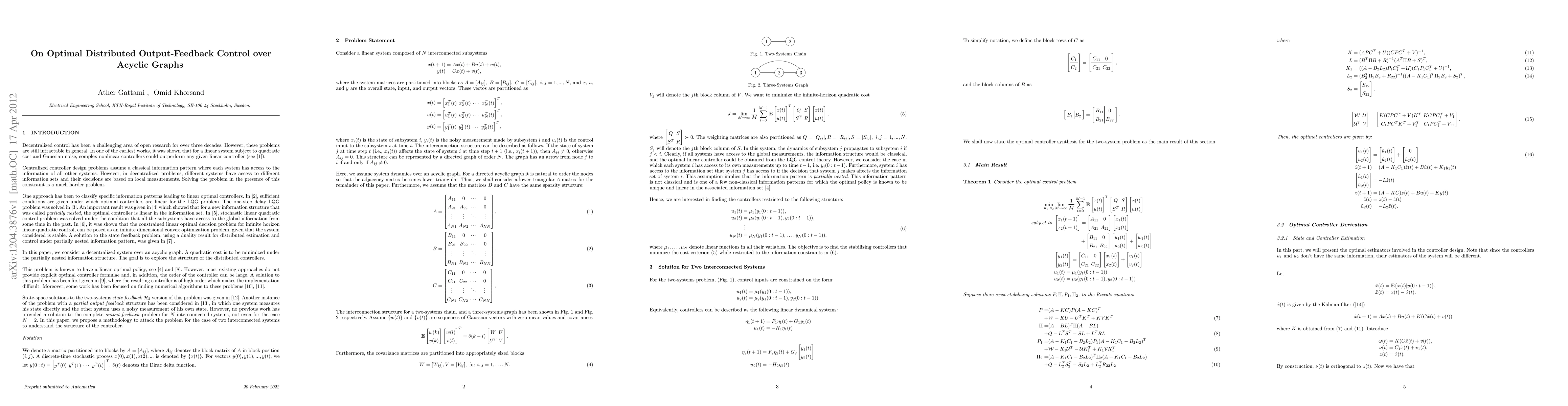 This paper addresses distributed optimal control of linear dynamical systems using output feedback over acyclic graphs, demonstrating that the optimal solution involves solving a combination of uncoupled and coupled Riccati equations.
