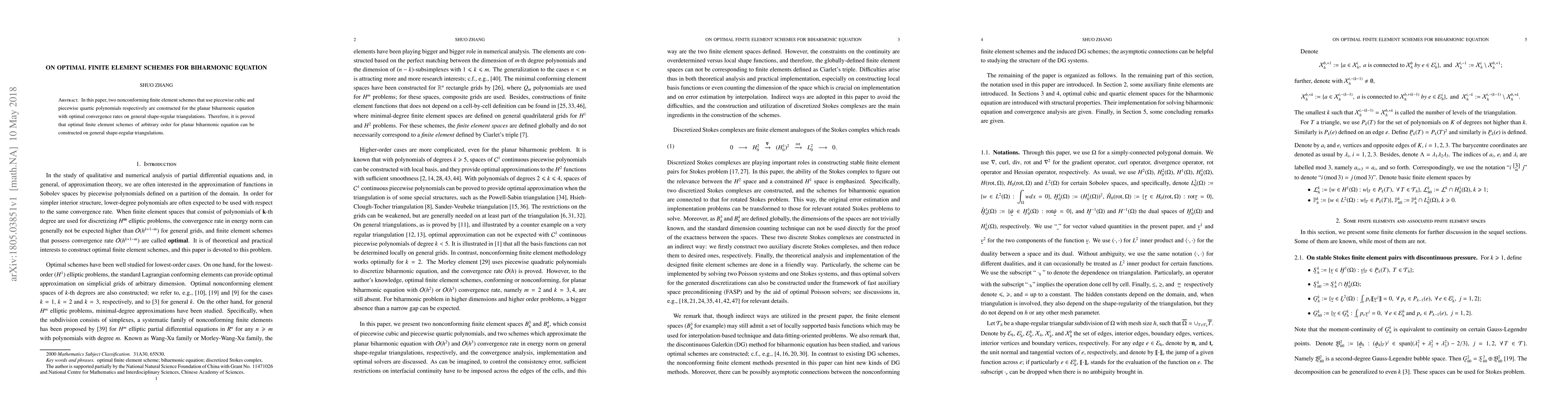 This paper constructs two nonconforming finite element schemes using piecewise cubic and quartic polynomials for the planar biharmonic equation, achieving optimal convergence rates on shape-regular triangulations, thereby proving the existence of optimal schemes of arbitrary order for this equation.