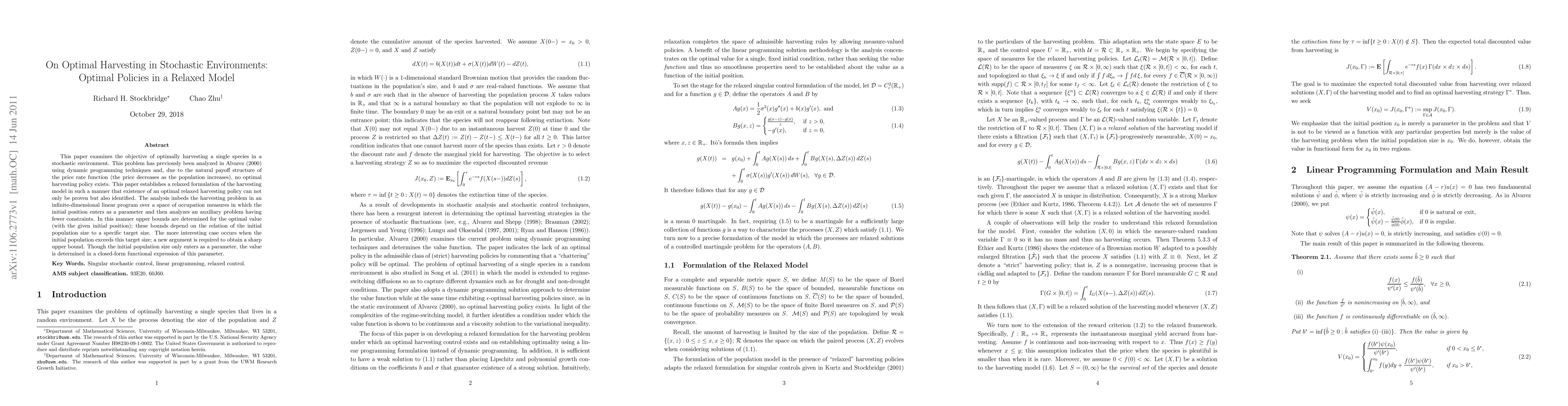 This paper proposes a relaxed model for optimally harvesting a single species in stochastic environments, proving the existence of an optimal policy where previously none existed. It utilizes an infinite-dimensional linear program and provides a closed-form expression for the optimal value based on the initial population size relative to a target size.