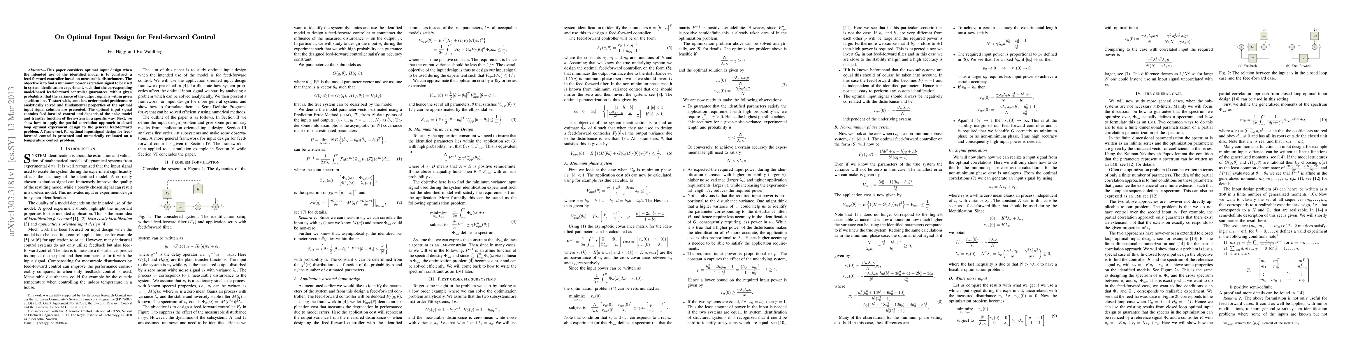 This paper develops a framework for optimal input design to construct a feed-forward controller based on measurable disturbances, aiming to minimize power while ensuring output variance specifications. It analytically solves low-order models and applies the partial correlation approach to general feed-forward problems, demonstrating the method through a temperature control example.