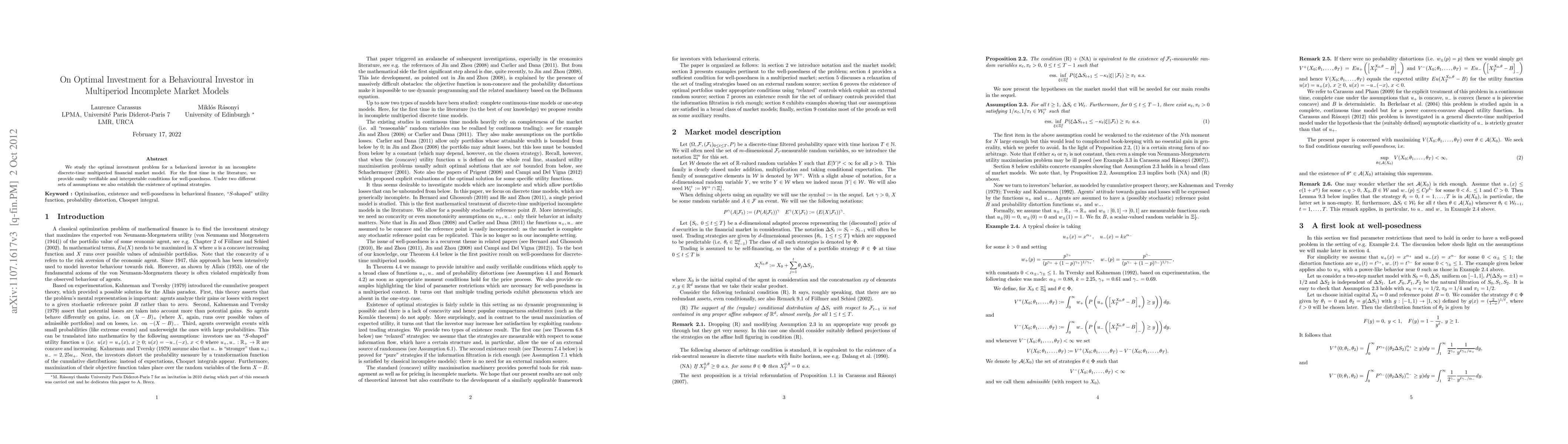 This research paper establishes conditions for optimal investment in behavioral finance models with incomplete markets, providing verifiable assumptions for well-posedness and existence of optimal strategies.