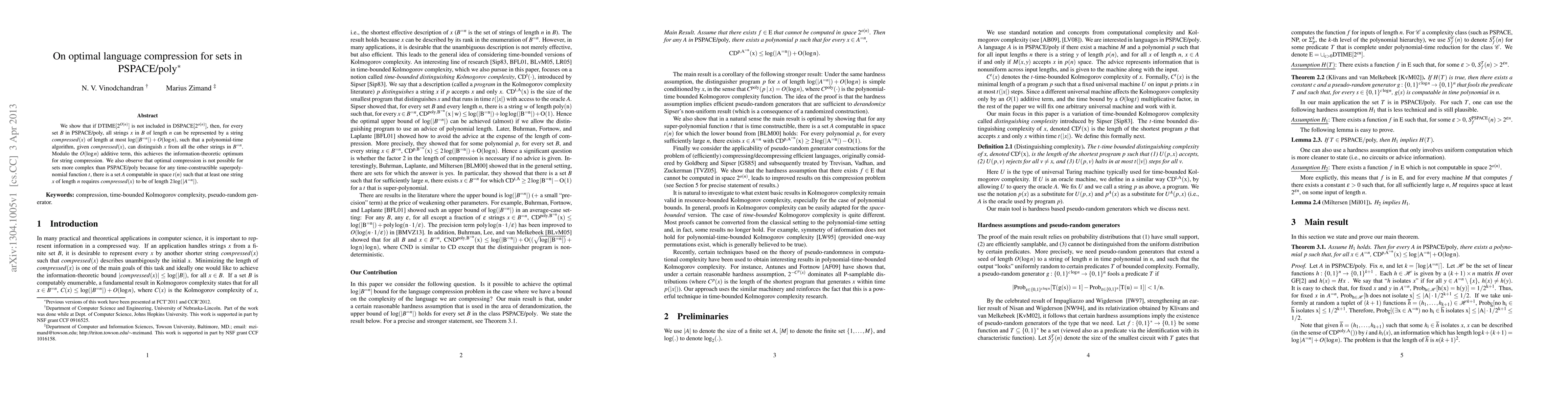 Researchers demonstrate that optimal language compression for sets in PSPACE/poly can achieve log(|B^{=n}|)+O(log n) string length, improving upon information-theoretic limits, while also proving optimal compression is impossible for more complex sets.