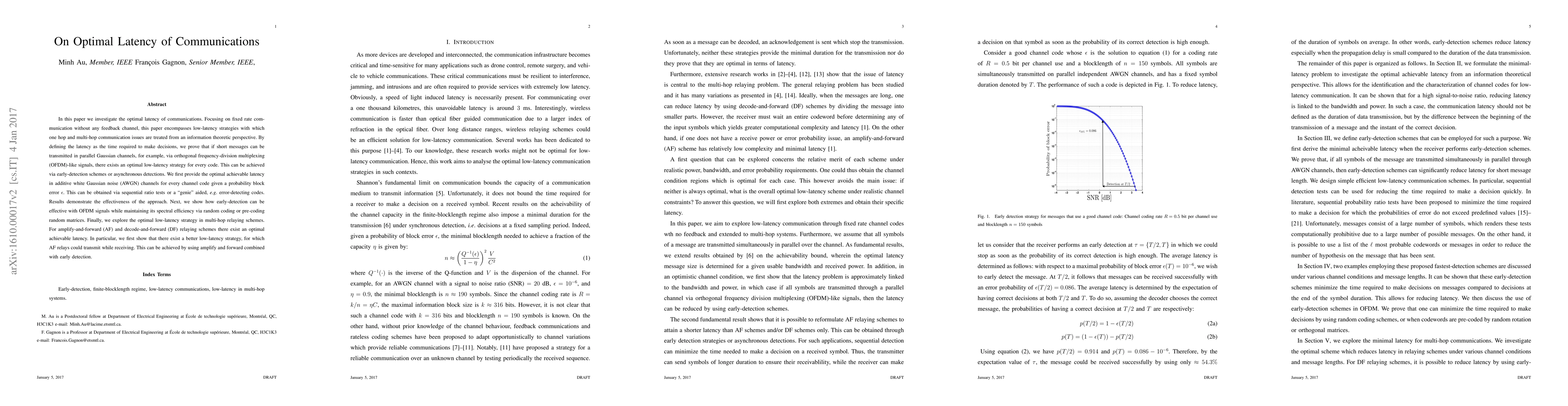 In this paper we investigate the optimal latency of communications. Focusing on fixed rate communication without any feedback channel, this paper encompasses low-latency strategies with which one hop and multi-hop communication issues are treated from an information theoretic perspective. By defining the latency as the time required to make decisions, we prove that if short messages can be transmitted in parallel Gaussian channels, for example, via orthogonal frequency-division multiplexing (OFDM)-like signals, there exists an optimal low-latency strategy for every code. This can be achieved via early-detection schemes or asynchronous detections. We first provide the optimal achievable latency in additive white Gaussian noise (AWGN) channels for every channel code given a probability block error $\epsilon$. This can be obtained via sequential ratio tests or a "genie" aided, \textit{e.g}. error-detecting codes. Results demonstrate the effectiveness of the approach. Next, we show how early-detection can be effective with OFDM signals while maintaining its spectral efficiency via random coding or pre-coding random matrices. Finally, we explore the optimal low-latency strategy in multi-hop relaying schemes. For amplify-and-forward (AF) and decode-and-forward (DF) relaying schemes there exist an optimal achievable latency. In particular, we first show that there exist a better low-latency strategy, for which AF relays could transmit while receiving. This can be achieved by using amplify and forward combined with early detection.