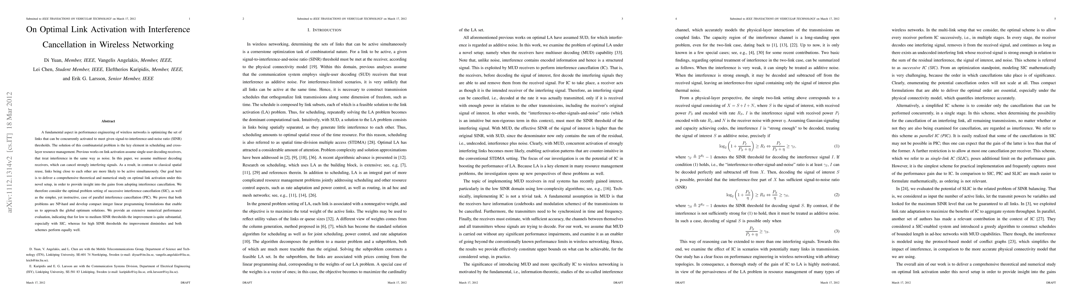 A fundamental aspect in performance engineering of wireless networks is optimizing the set of links that can be concurrently activated to meet given signal-to-interference-and-noise ratio (SINR) thresholds. The solution of this combinatorial problem is the key element in scheduling and cross-layer resource management. Previous works on link activation assume single-user decoding receivers, that treat interference in the same way as noise. In this paper, we assume multiuser decoding receivers, which can cancel strongly interfering signals. As a result, in contrast to classical spatial reuse, links being close to each other are more likely to be active simultaneously. Our goal here is to deliver a comprehensive theoretical and numerical study on optimal link activation under this novel setup, in order to provide insight into the gains from adopting interference cancellation. We therefore consider the optimal problem setting of successive interference cancellation (SIC), as well as the simpler, yet instructive, case of parallel interference cancellation (PIC). We prove that both problems are NP-hard and develop compact integer linear programming formulations that enable us to approach the global optimum solutions. We provide an extensive numerical performance evaluation, indicating that for low to medium SINR thresholds the improvement is quite substantial, especially with SIC, whereas for high SINR thresholds the improvement diminishes and both schemes perform equally well.