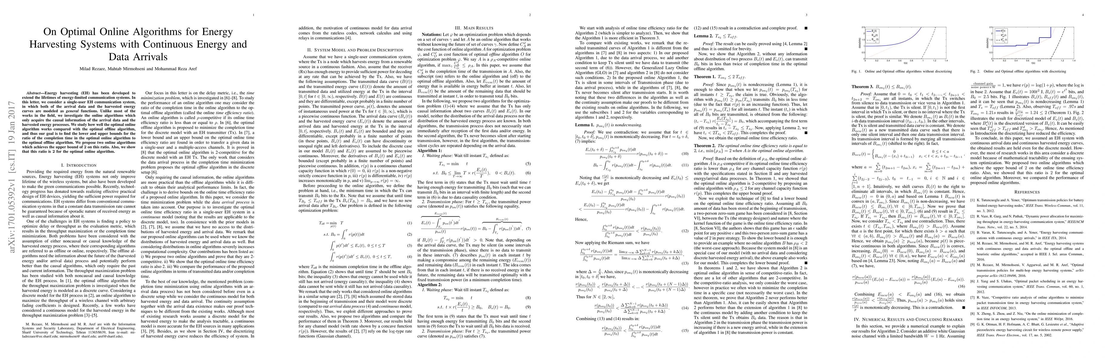 This paper investigates optimal online algorithms for energy harvesting communication systems with continuous energy and data arrivals. It proposes two online algorithms achieving an upper bound of 2 for the ratio of their completion time compared to the optimal offline algorithm, confirming this ratio as 2 for the optimal online algorithm.
