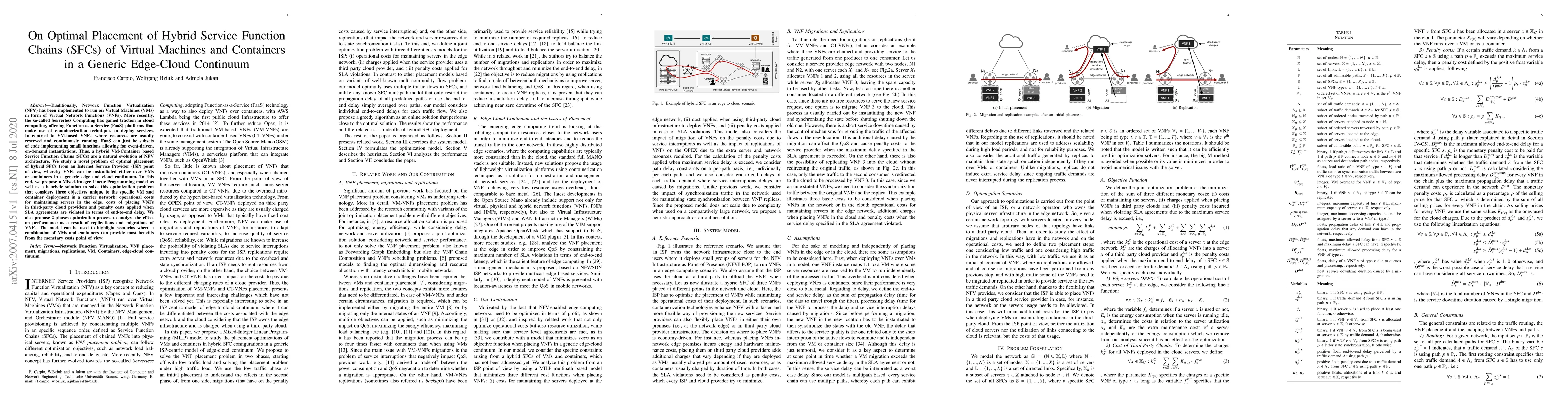 This paper proposes an optimization model for the placement of hybrid Service Function Chains (SFCs) combining Virtual Machines and containers in an edge-cloud continuum, aiming to minimize operational and third-party costs while adhering to Service Level Agreements (SLAs). It introduces a Mixed-Integer Linear Programming model and a heuristic solution, along with a two-phase optimization process to evaluate the impact of VNF replications and migrations.