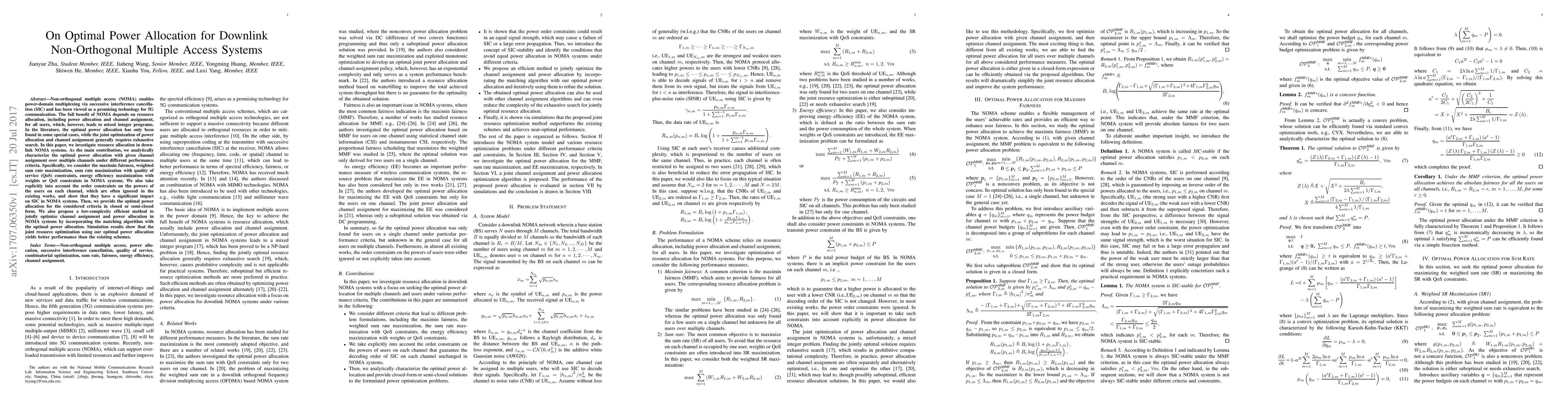 This paper investigates optimal power allocation in downlink non-orthogonal multiple access (NOMA) systems, providing analytical solutions for various performance criteria including fairness, sum rate maximization, and energy efficiency. It also introduces a low-complexity method for joint channel and power allocation optimization, demonstrating superior performance over existing schemes.