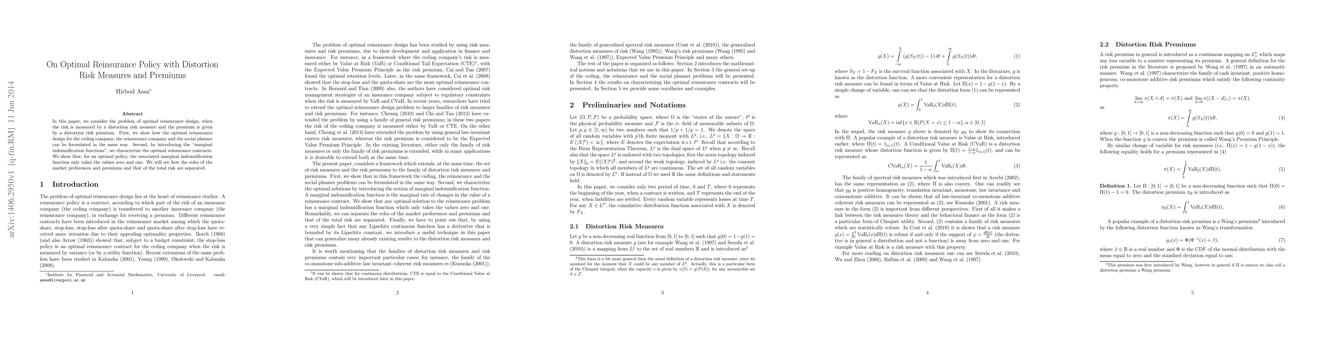 In this paper, we consider the problem of optimal reinsurance design, when the risk is measured by a distortion risk measure and the premium is given by a distortion risk premium. First, we show how the optimal reinsurance design for the ceding company, the reinsurance company and the social planner can be formulated in the same way. Second, by introducing the marginal indemnification functions, we characterize the optimal reinsurance contracts. We show that, for an optimal policy, the associated marginal indemnification function only takes the values zero and one. We will see how the roles of the market preferences and premiums and that of the total risk are separated.