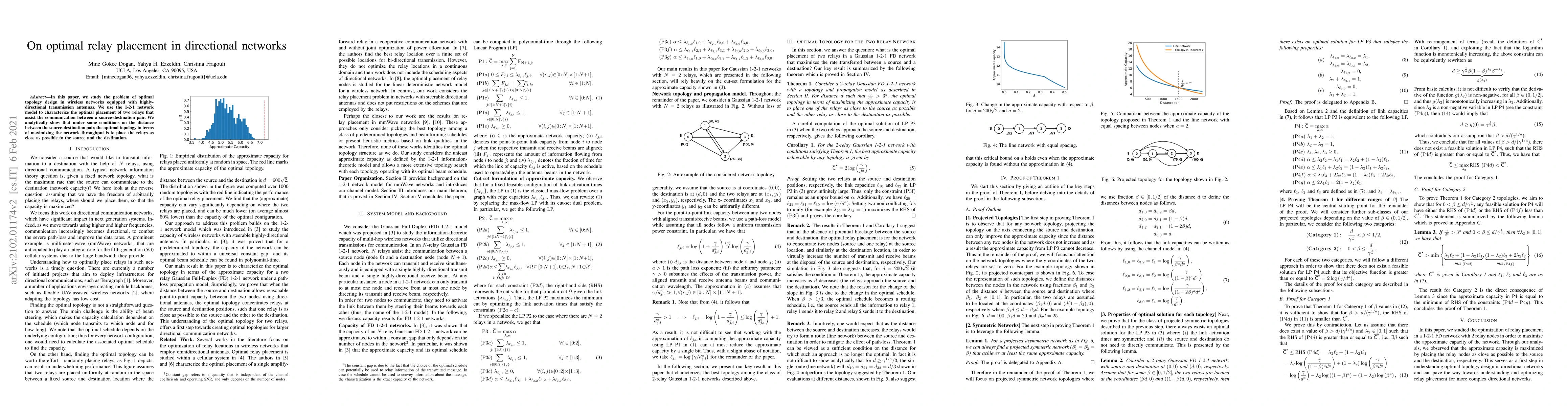 In this paper, we study the problem of optimal topology design in wireless networks equipped with highly-directional transmission antennas. We use the 1-2-1 network model to characterize the optimal placement of two relays that assist the communication between a source-destination pair. We analytically show that under some conditions on the distance between the source-destination pair, the optimal topology in terms of maximizing the network throughput is to place the relays as close as possible to the source and the destination.