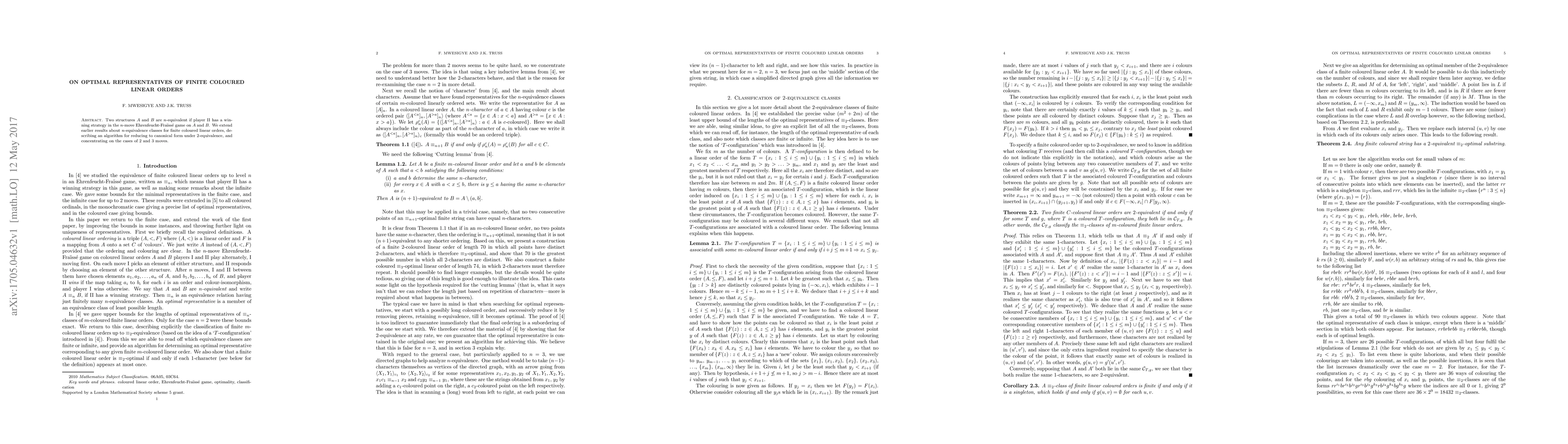 This paper develops an algorithm to reduce finite coloured linear orders to a canonical form under 2-equivalence, focusing on the cases of 2 and 3 moves in the Ehrenfeucht-Fraisse game.