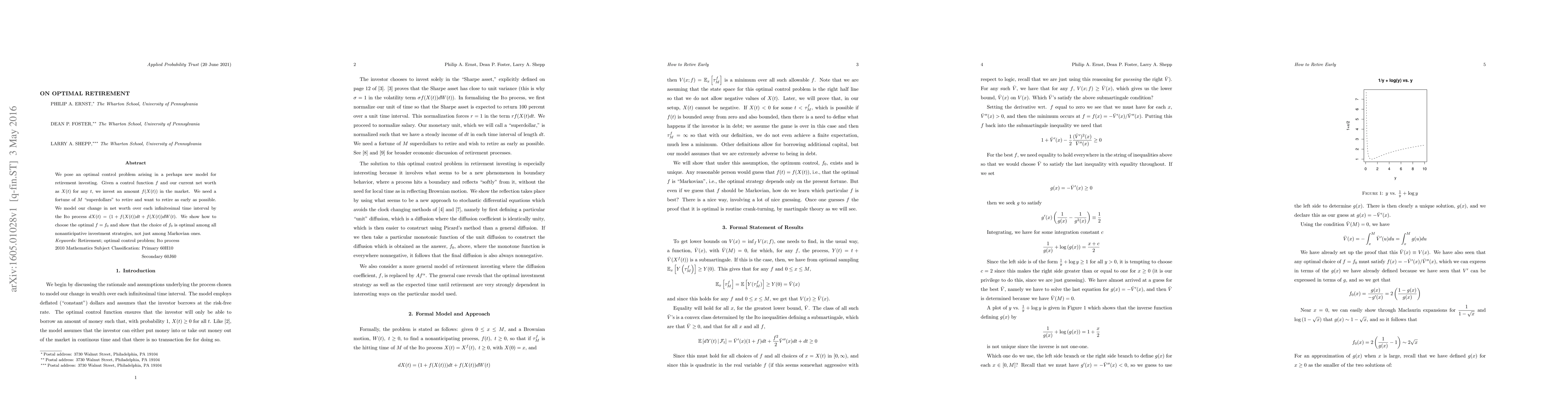 We pose an optimal control problem arising in a perhaps new model for retirement investing. Given a control function $f$ and our current net worth as $X(t)$ for any $t$, we invest an amount $f(X(t))$ in the market. We need a fortune of $M$ "superdollars" to retire and want to retire as early as possible. We model our change in net worth over each infinitesimal time interval by the Ito process $dX(t)= (1+f(X(t))dt+ f(X(t))dW(t)$. We show how to choose the optimal $f=f_0$ and show that the choice of $f_0$ is optimal among all nonanticipative investment strategies, not just among Markovian ones.